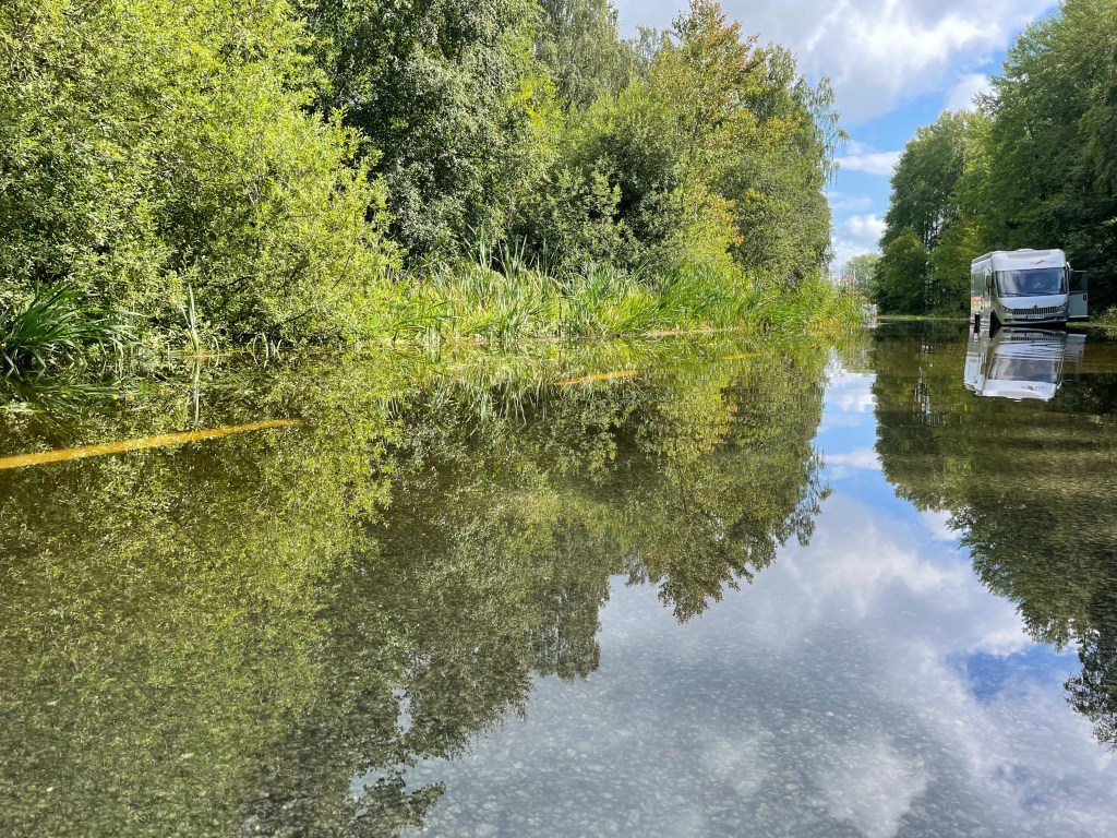 I helgen var jag delvis själv hemma, maken var på vandringstur på Visingsö med sitt träningsgäng (japp, skulle sova ute natten lördag-söndag när det regnade som MEST), så det mesta av helgen gick mest åt till att ta hand om familj och gård (inte mig emot). Stormen Hans gav oss inga jättebekymmer inledningsvis förutom den ruttnade grenen som ramlade ner, men i helgen blev det ju ÄNNU mer regn. När jag skulle skjutsa äldsta sonen till Bunn fick vi stanna och inse att vi inte kunde köra ända fram – det ser inte så djupt ut där husbilen är parkerad men utmed resten av vägen var det nästan 7-8 decimeter högt med vatten. Sonen fick ta av sig barfota och traska förbi översvämningen för att bli upplockad på andra sidan, så det löste sig ändå. Efter allt regnande denna sommar är jag extremt glad att vi bor som vi bor, på en liten ”kulle”.