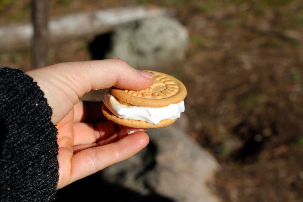Trä marsmallows på en pinne och rosta försiktigt tills de är lätt gyllene. Kläm en grillad marschmallow mellan två kex och ät!