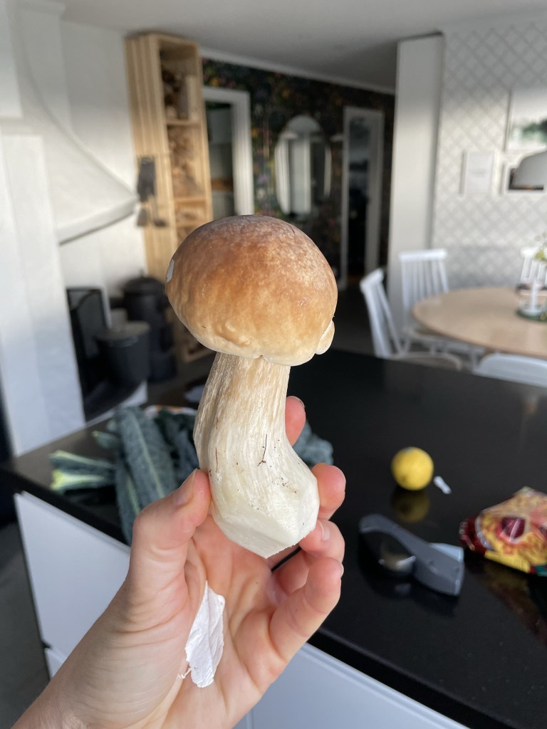 ”Vad är det för speciellt med den då” kanske ni undrar, är ju bara kött, sås och potatis. Ja, det är det, men det enda på hela denna tallriken som inte kommer från vår gård är mejerivarorna (smöret jag stekt i och grädden i såsen) och lite kryddor! Det här är alltså helstekt kottlettrad, hassebakspotatis och en sås med Karljohan-svamp (som jag sjuk nog hittade en på kullen bakom huset så den är också ”egen”) och så en svartkålssallad. Det var så sjukt gott!