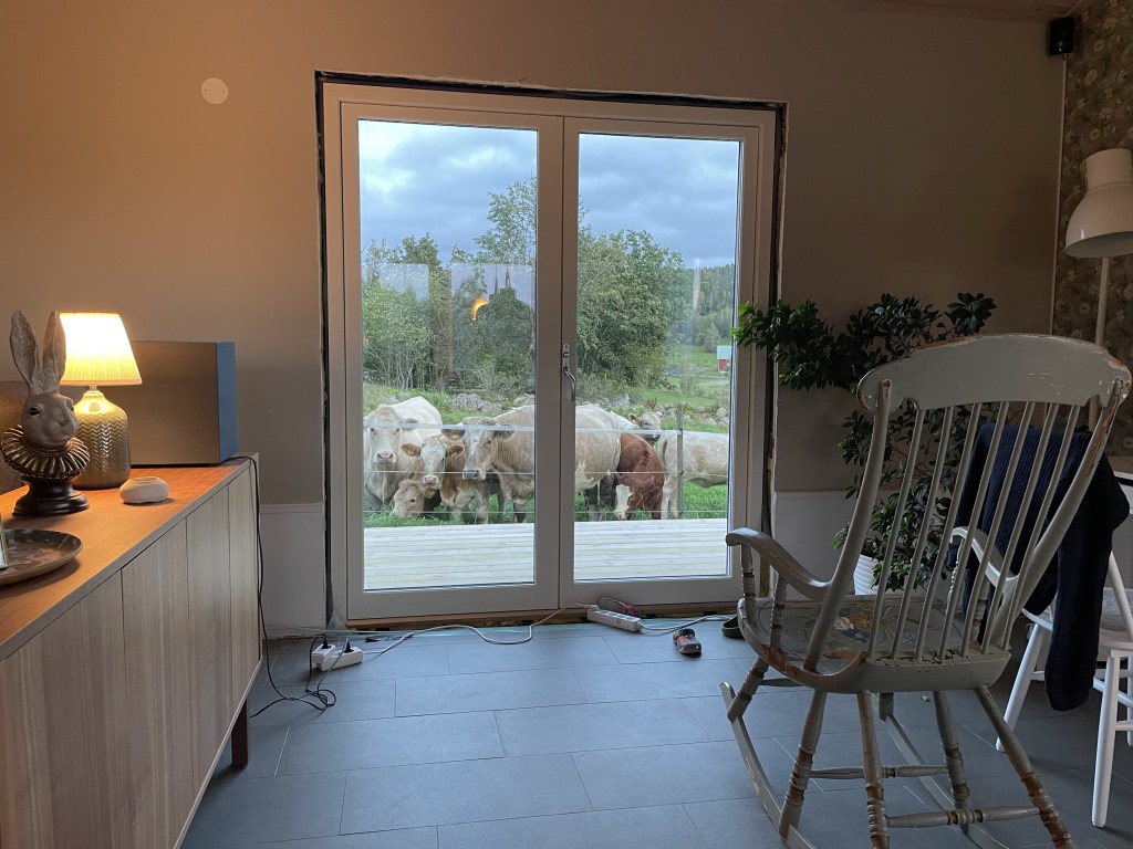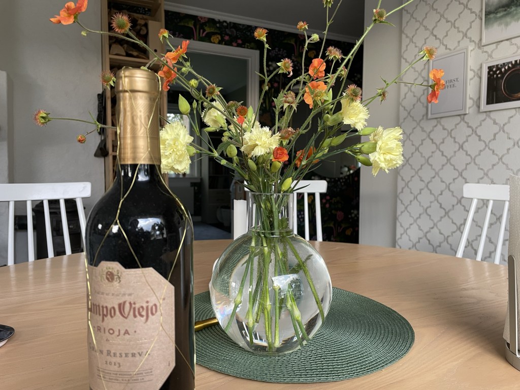 Blev så lycklig att det fick bli både en flaska fin-vin och en nyinplockad, spretig liten bukett på bordet. Fint sällskap fick vi till middagen med, av grannens kor som nu bytt bete till det utanför vårt hus, så himla charmigt att ha dem så nära.