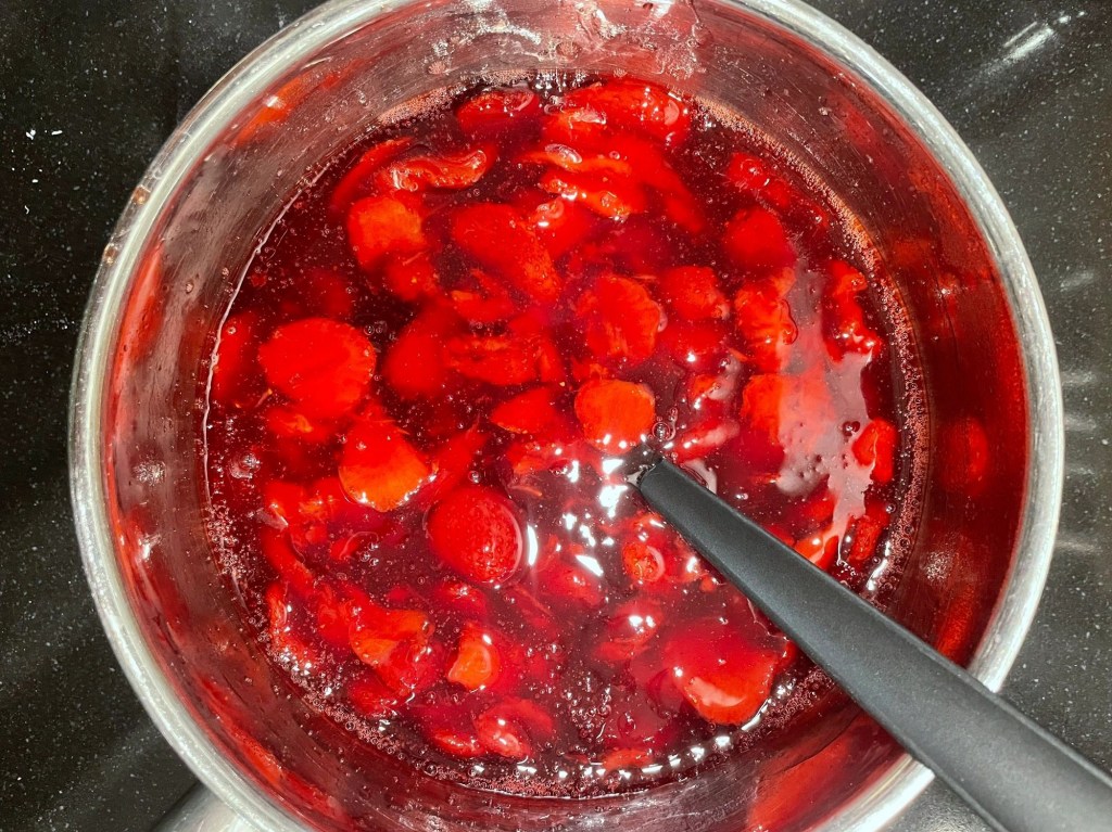 Nu kommer vi till saftsåsen, den tyckte jag inte om när jag var liten, men när vi lärde oss att röra ner en burk fryst, rårörd jordgubbssylt i så är den helt fantastisk! Har du nu inte rutinen att göra just sån sylt för att använda just till detta såklart, så kan du nog köpa lite frysta jordgubbar, tina och skiva ner, för att få lite mer fräschör. Eller frysta hallon kanske? Jag gör saftsåsen på egen saft (körsbär var det jag hade nu), men köpesaft av bättre kvalitet går också bra.