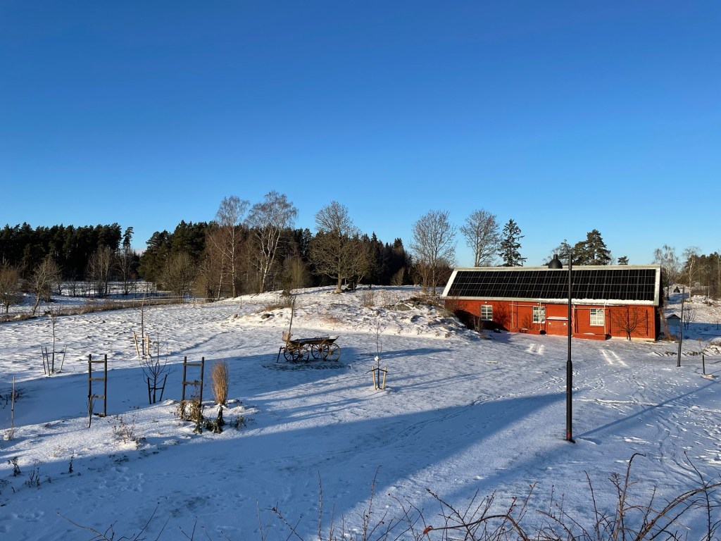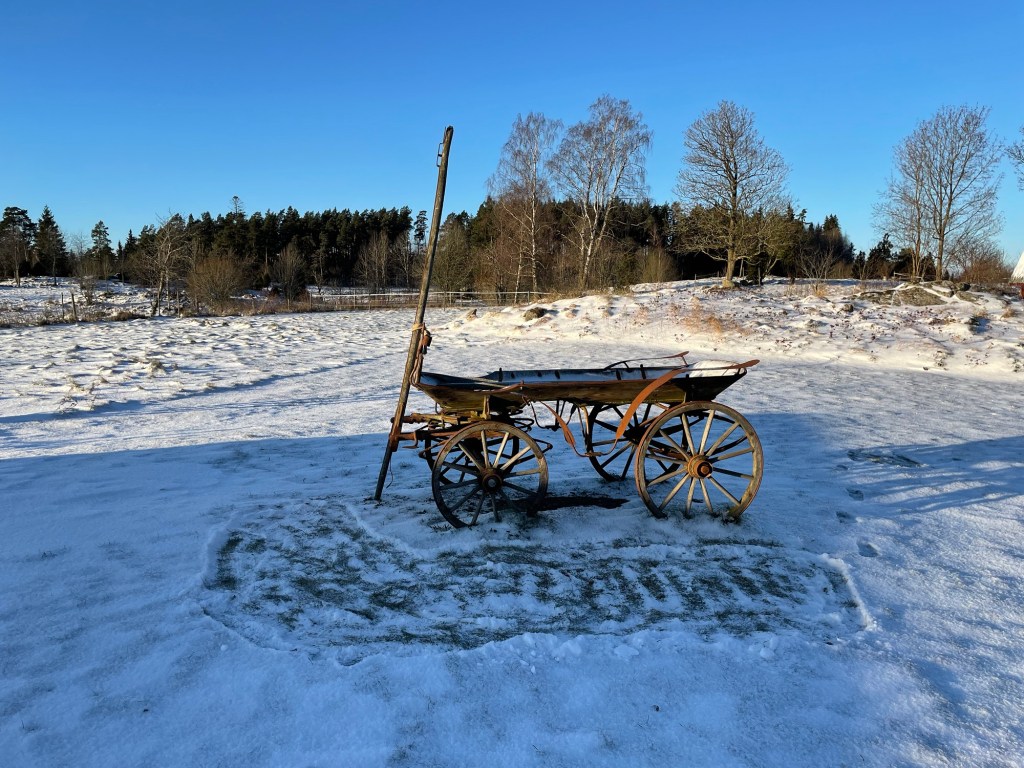På bilden här ovan så har jag sparkat bort lite snö (ypperligt tillfälle att skissa på rabatter när det är snö) där jag skulle vilja ha min rosenrabatt. Allt ser ju så pluttigt ut här på gården, så man behöver liksom samla växter och sånt för att det ska bli nåt av det hela. Det är dock gissningsvis ganska tunn jordmån här eftersom det sticker upp berg under den fina gamla hästvagnen, men jag tänkte att jag kanske kunde bygga upp ett land lite på höjden med hjälp av marksten vi har ett mindre förråd av nere vid stallet. Tänker mig klätterrosor som får klättra upp över vagnen lite, framme vid handtagen och så – visst kan det bli fint?