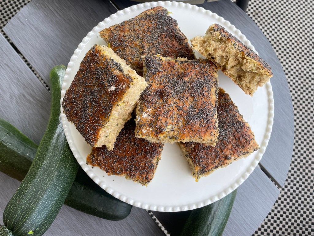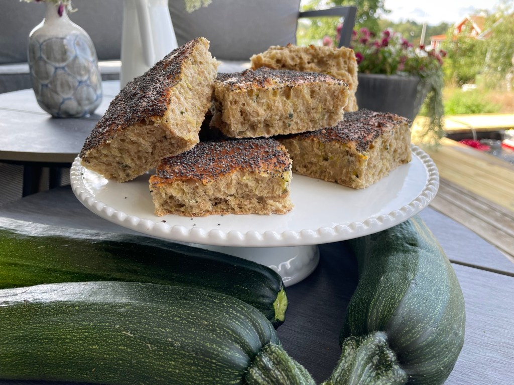 Lägg lite mjöl, typ 5 dl, i en skål och häll över jästen – låt stå i tio minuter. Riv under tiden zucchini och krama ur – använd vätskan ihop med vatten som degvätska. Värm vätskan till fingervarmt, och tillsätt den och alla andra ingredienser, förutom vanligt mjöl, till bunken. Knåda i maskin eller för hand – och allt eftersom det släpper vätska från zucchinin så tillsätter du vanligt mjöl tills du har en lös men inte rinnande deg.