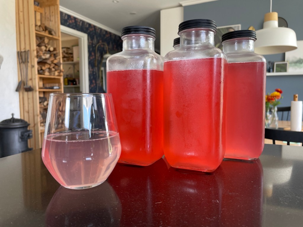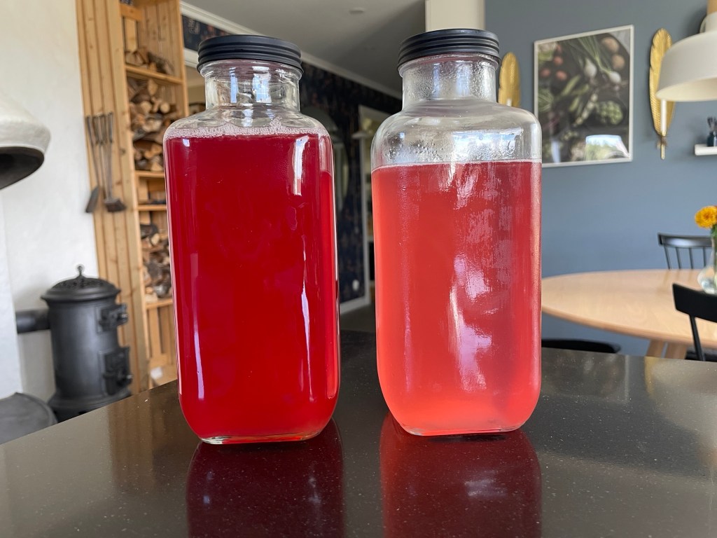 När vi var ute hos en jobbarkompis för att kika på trädgård, få tips om etage-bäddar och umgås i största allmänhet, så serverade hon en helt fantastisk lemonad på rabarber. Den var riktigt gott syrlig och fräsch, och gav verkligen mersmak! Nedan följer receptet, och på de rabarber som blir kvar (alla) så kokar jag även en omgång klassisk rabarbersaft.