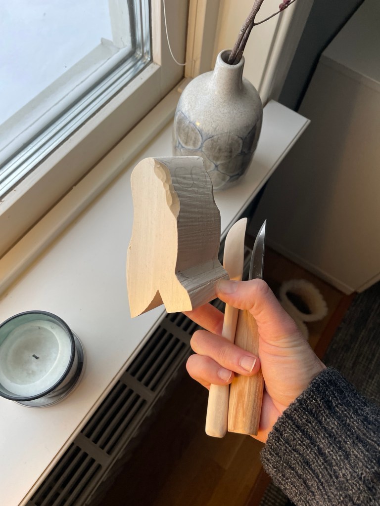 En skön grej när man varit ute några timmar är ju också att det är otroligt skönt att komma hem och mysa och ta det lugnt med. I dag har jag plockat ner alla juliga saker förutom ljusstakar och stjärnor, men har lämnat granar och annat som inte är lika jul-kodat. Och så har jag tagit ut julgranen då. Däremellan har jag roat mig med ett tv-spel Filip fick i julklapp (AstroBot) och med att tälja. Jag har precis börjat med min uggla – har kommit längre än på bilden men orkar inte fota nåt nytt just nu.