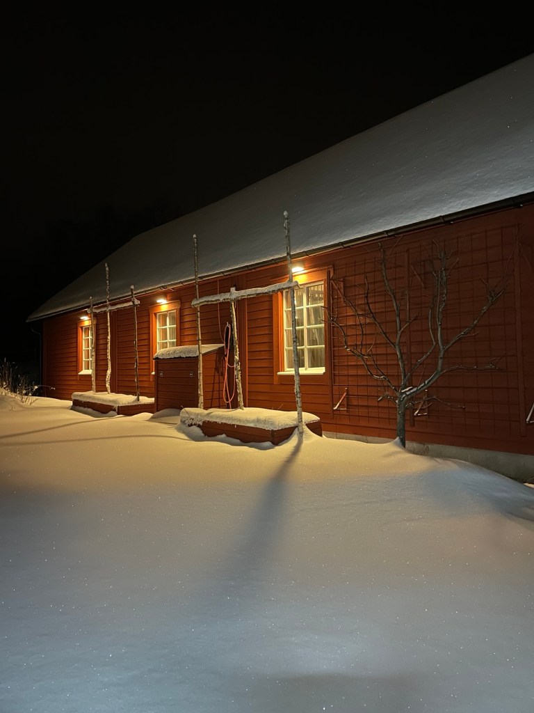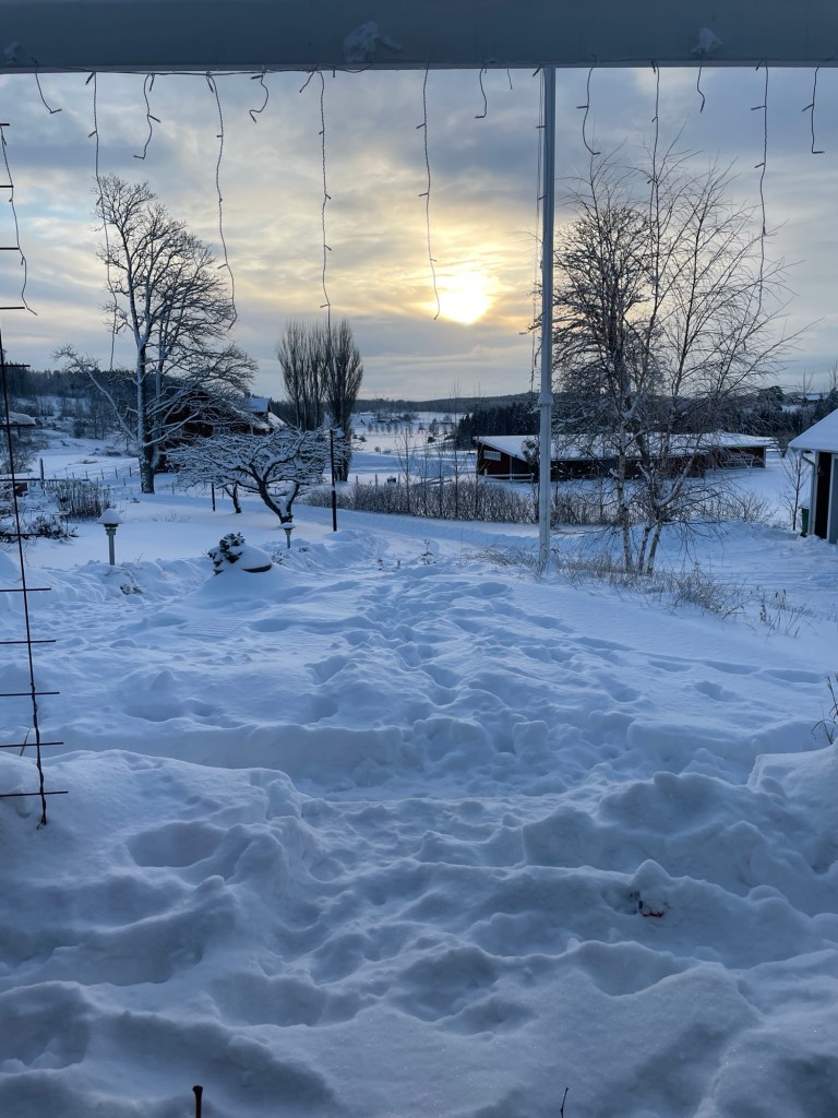 Jag har just gått ner med en skottkärra fylld med den nerklippta julgranen till grovkomposten vid stallet. Jag stannar till bredvid lekstugan/svinstian där grisarna mumsar på sin kvällsmat – spannmål i varmvatten. Deras smackande är det enda som hörs, i övrigt är det helt knäpptyst, och de två decimeter snö som kommit gör att det nästan känns som världen är insvept i bomull. Det är kallt ute, -7 grader och verkar bli kallare i natt, katterna springer in och ut för att värma sig (och för att komma undan dammsugaren som är väldigt läskig).