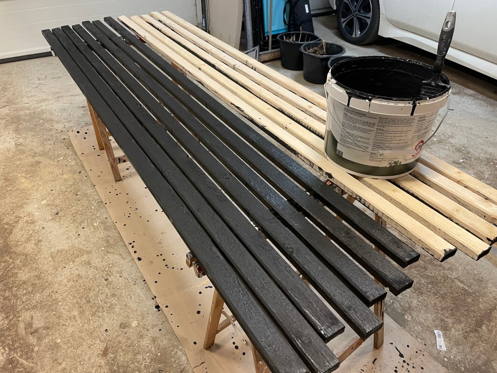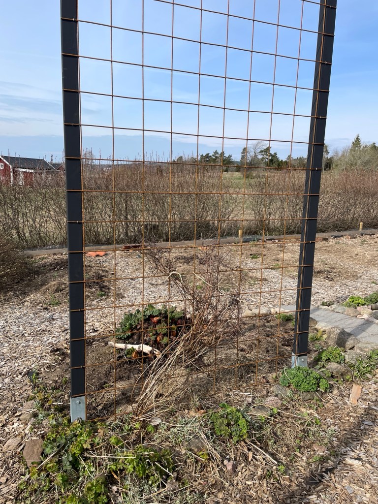 Planen för dagen är i alla fall att måla lite lockläkt som ska bli vindskydd/siktskydd för soptunnorna, samt överliggare till de nya växtstöd och portaler vi satte upp i helgen. Orkar jag ska jag såpskura den sista trallen med. Sen är frågan om jag ska göra en så-snigel och försöka så lite av de blommixer jag köpte från Fröbanken. Nu har äntligen vitlöken vi sådde i höstas (300 klyftor ni vet) börjat titta upp – typ överallt faktiskt – men det innebär också att jag inte riktigt vet vart jag ska ha blommorna… Måste nog bli lite inklämt mellan lökarna, hur det nu än blir, annars har jag BARA vitlök och det är ju inte så kul. Funkar ju heller inte alls bra att fröså direkt i landen här, jag har inte riktigt möjlighet att ”dalta” med de sådderna så de har en tendens att antingen torka bort eller trängas bort av ogräs när jag inte vågar rensa just där.