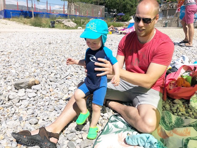 Här noterade vi även för första gången att det är ebb och flod här? Det skiljde nog 20-30 cm ungefär, men det var ju lätt att se mot klipporna jämfört med på en strand. Badskorna som Lukas håller på att ta på sig är ett måste men gör det samtidigt väldigt enkelt att bada trots klippor.
