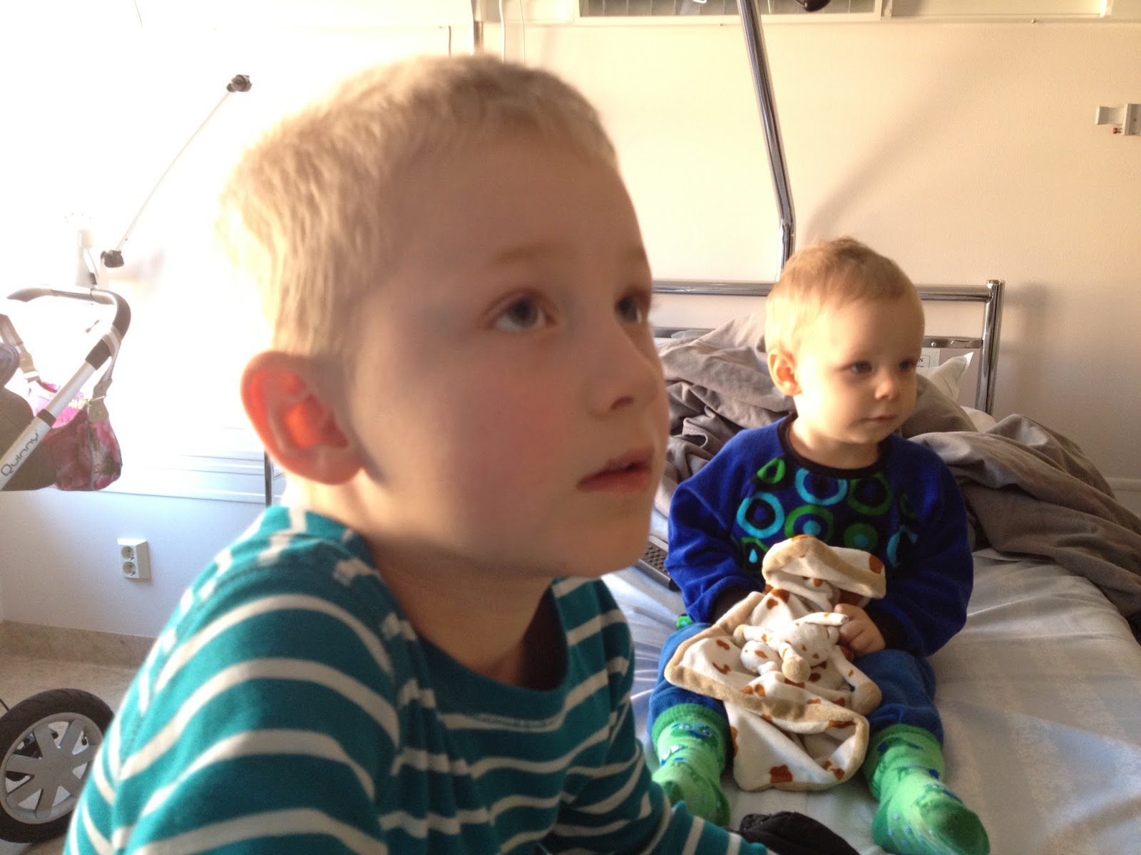Nåväl, nu blev vi helt plötsligt inlagda på barnavdelningen, och Lukas fick antibiotika intravenöst och dropp över natten (han har ju inte så mycket att ta av längre, tunnisen), så det blev till att snabbt åka hem och ta en dusch och hämta övernattningsgrejor för mig. Man sover inte så bra på sjukhus direkt – eller alls, egentligen… Vi trodde först att vi skulle få komma hem direkt på morgonen, men då fick vi veta att det skulle ges antibiotika minst till nästa dag.