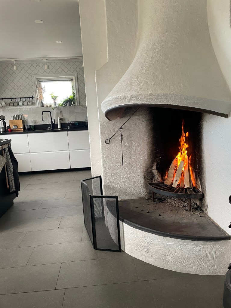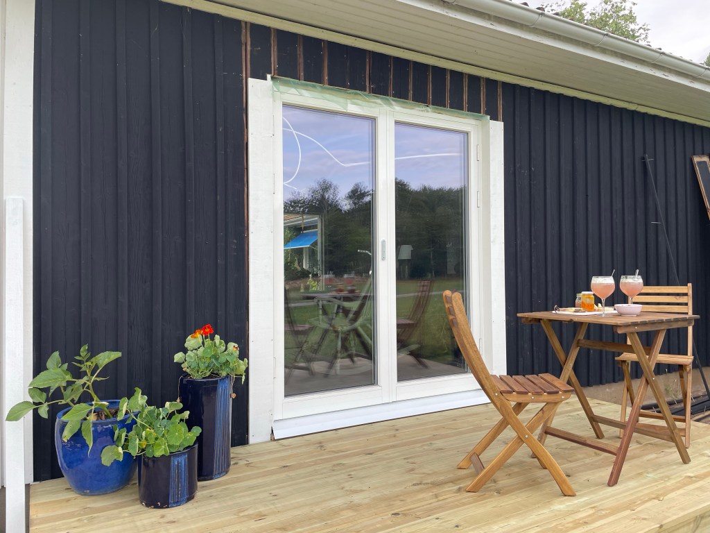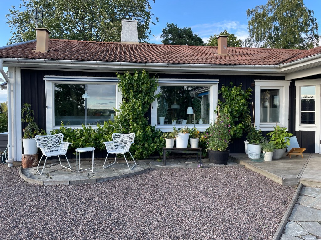 Jag älskar vårt kök, med de enorma fönstren och det runda bordet som ger en mycket trevligare samtalsmiljö än ett kantigt. Jag älskar den lilla sittplatsen framför vinrankan, här är ofta lä och det är en perfekt plats att ta en kaffe och titta ut över omgivningarna. Här är ju planen att det ska bli trätrall istället, så stolarna står jämnare och det inte blir så vansinnigt mycket ogräs som växer upp. Älskar den nya altanen i österläge, där man kan sitta i skugga på eftermiddagen men framförallt ta sin morgonkaffe i soluppgången. Hittade ingen bild från när den var klar dock, det måste vi ju åtgärda till sommaren! Jag älskar den lilla altanen framför växthuset, med utsikt över köksträdgården – även om den inte är färdig. Det ska bli en pergola över den här, med lite klätterväxter och annat, så den känns lite mer ombonad och mer som ett rum i trädgården. Blir nog kanon!Älskar vår lilla ”loungeyta” som har kvällssol och är nästan helt skyddad från blåst – efter en hel dag ute här så är det makalöst skönt att få landa i soffan med något gott i glaset och kanske en bit ost. Och självklart är en älsklingsplats vintertid framför brasan i köket eller kaminen i vardagsrummet!