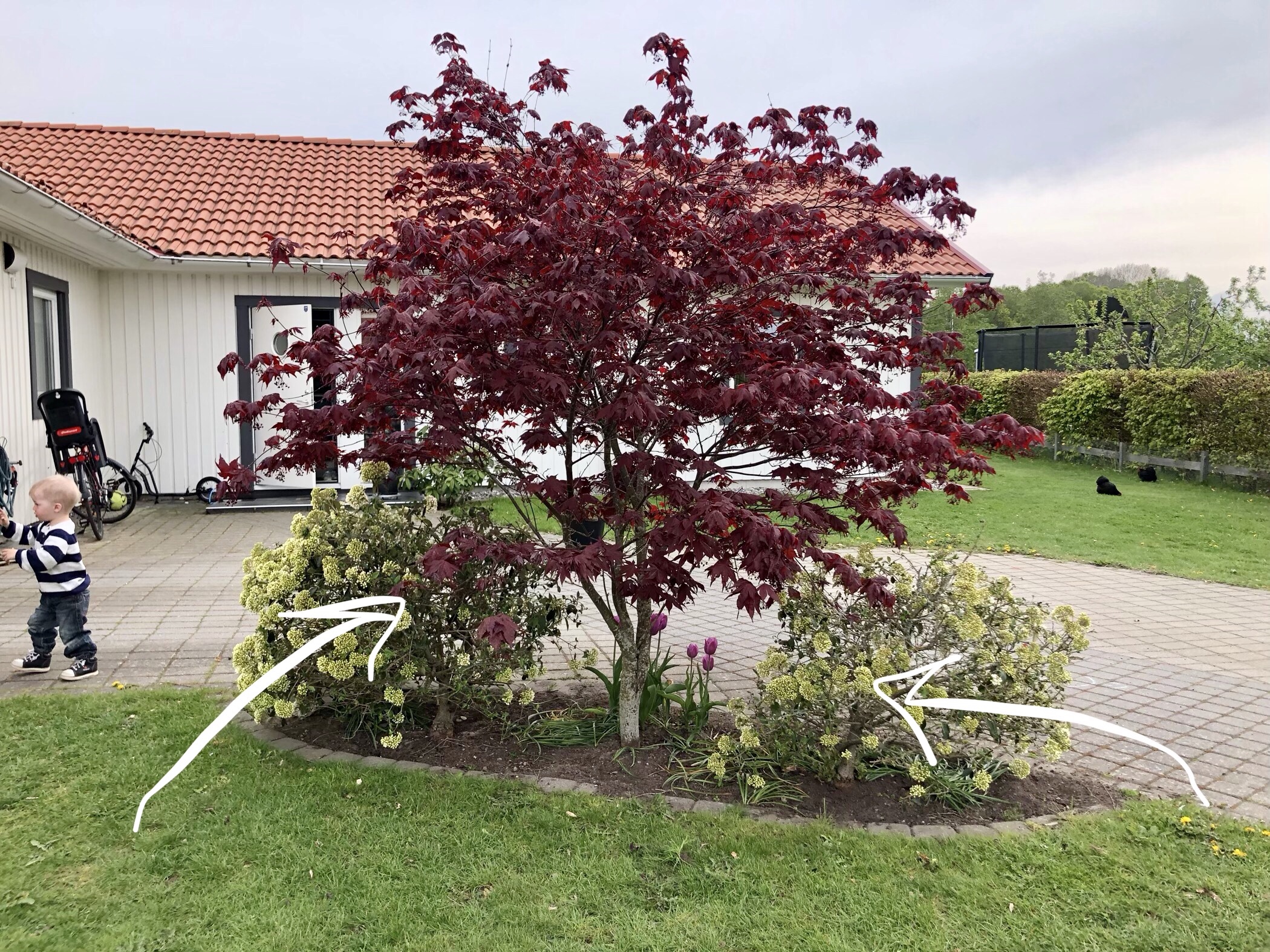 Vid vår garageinfart står en otroligt vacker blod-lönn som vi aldrig trodde skulle klara sig, men den frodas! Dock så pass mycket att buskarna under blivit ganska fula, så när de blommat klart ska de tas bort.