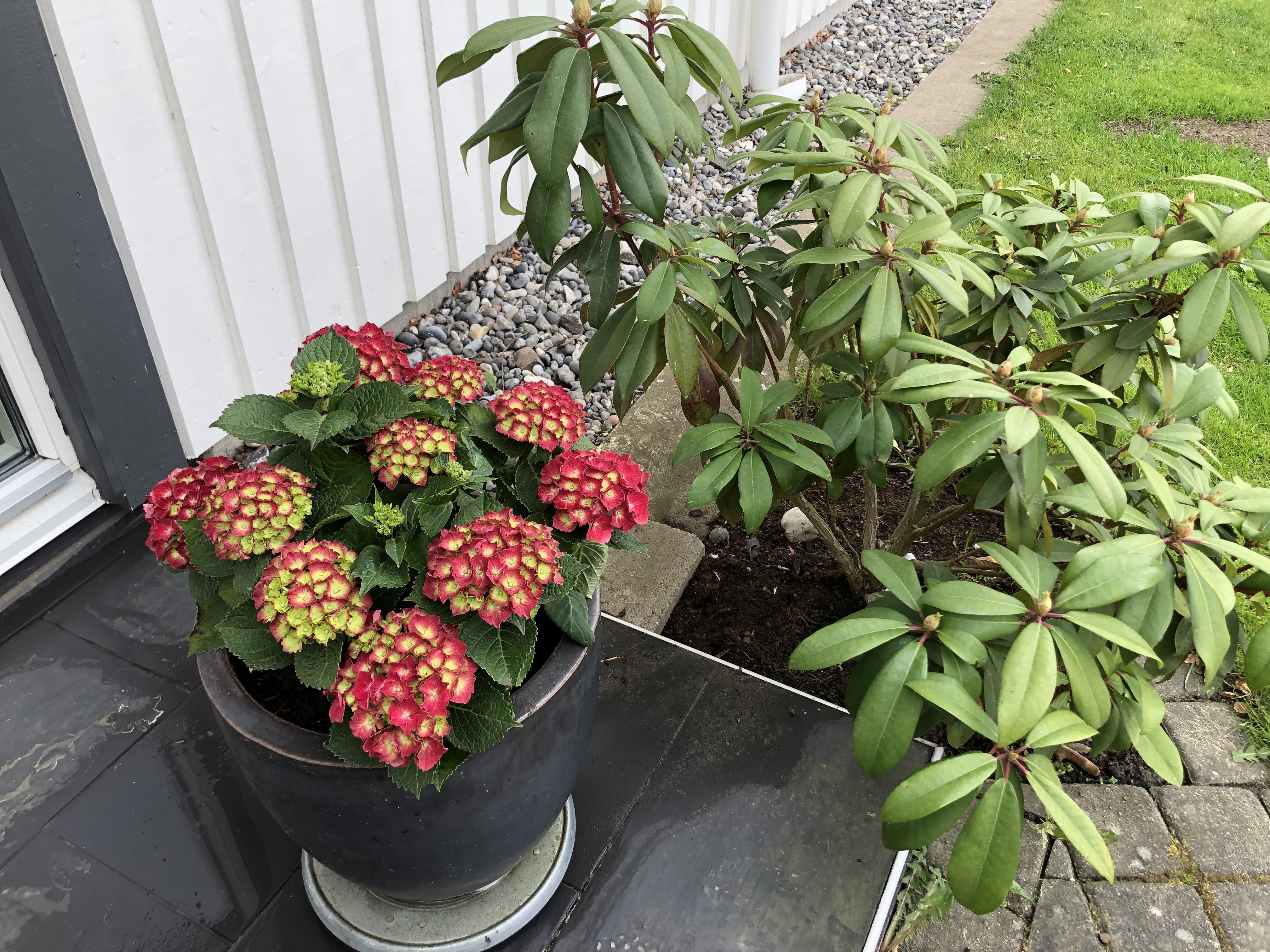 Vid entrén har jag precis satt en hortensia och här bor även permanent en dvärg-rhododendron.