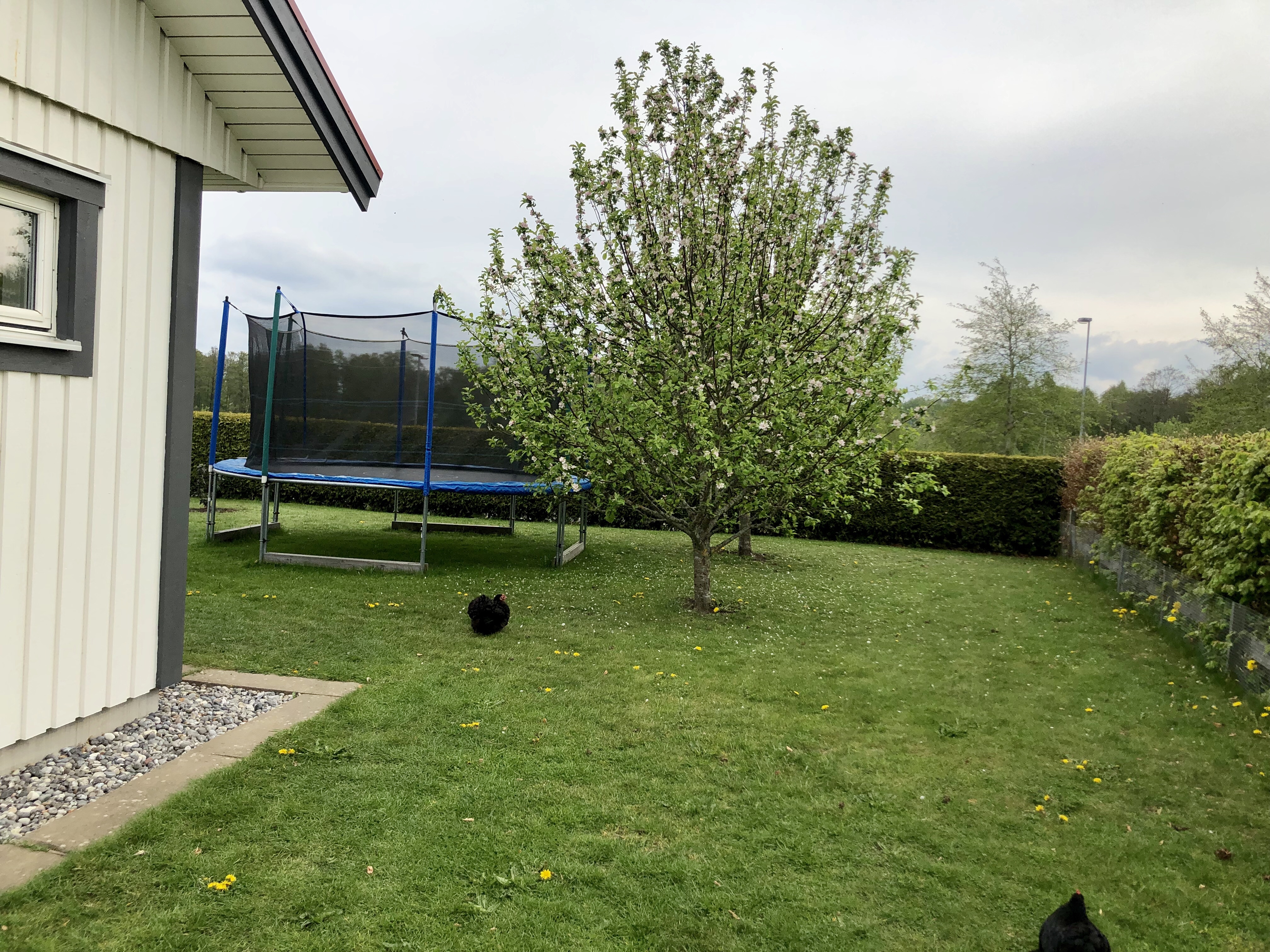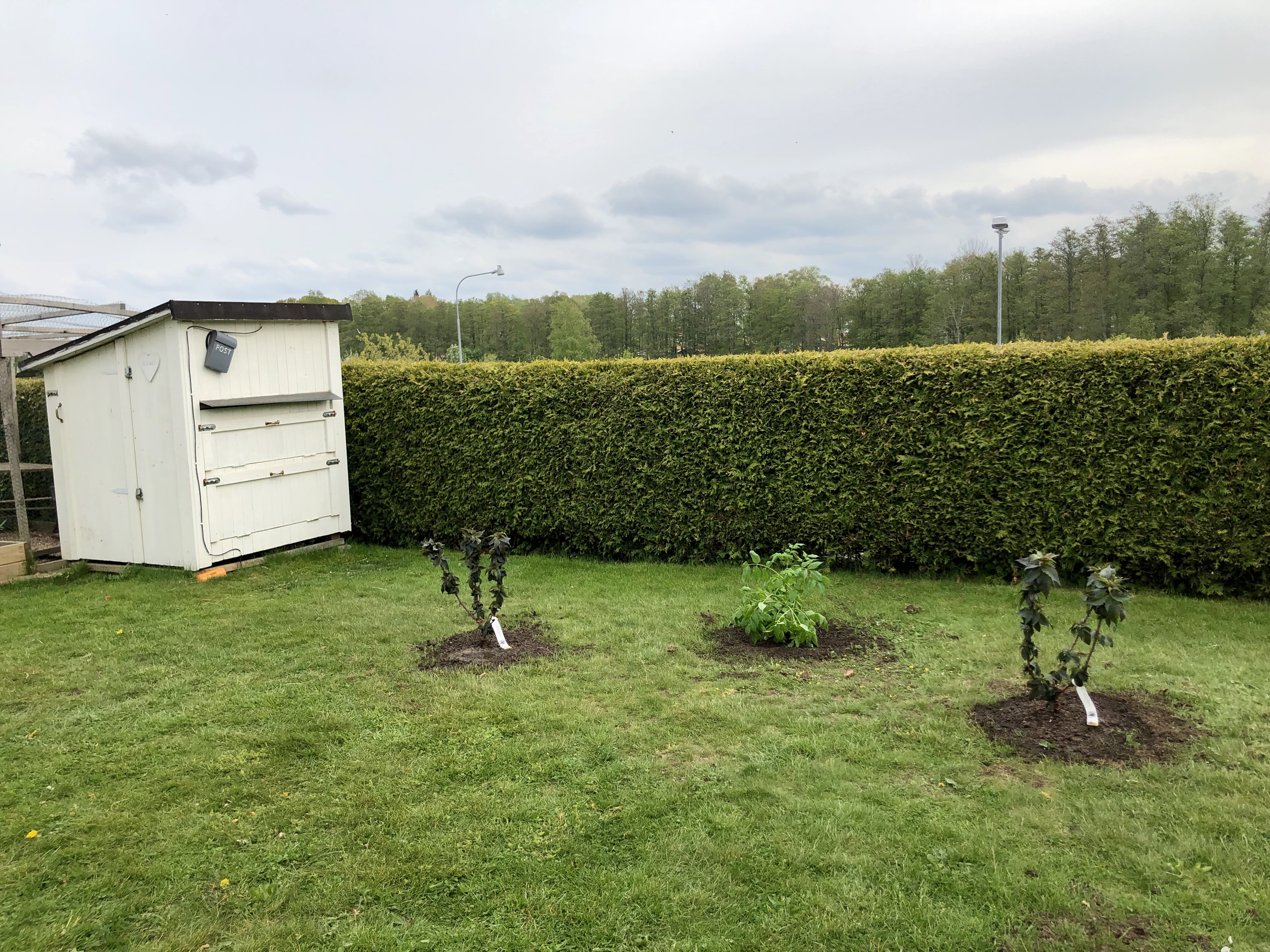 Mellan äppelträd och hönshus hamnade våra tre fläder, min tanke är något åt berså-hållet så jag kommer kanske sätta något mindre i kanterna med. Fläder kan ju bli stor, 3-5 meter står det på den vanliga i mitten och bara något kortare på de röda!