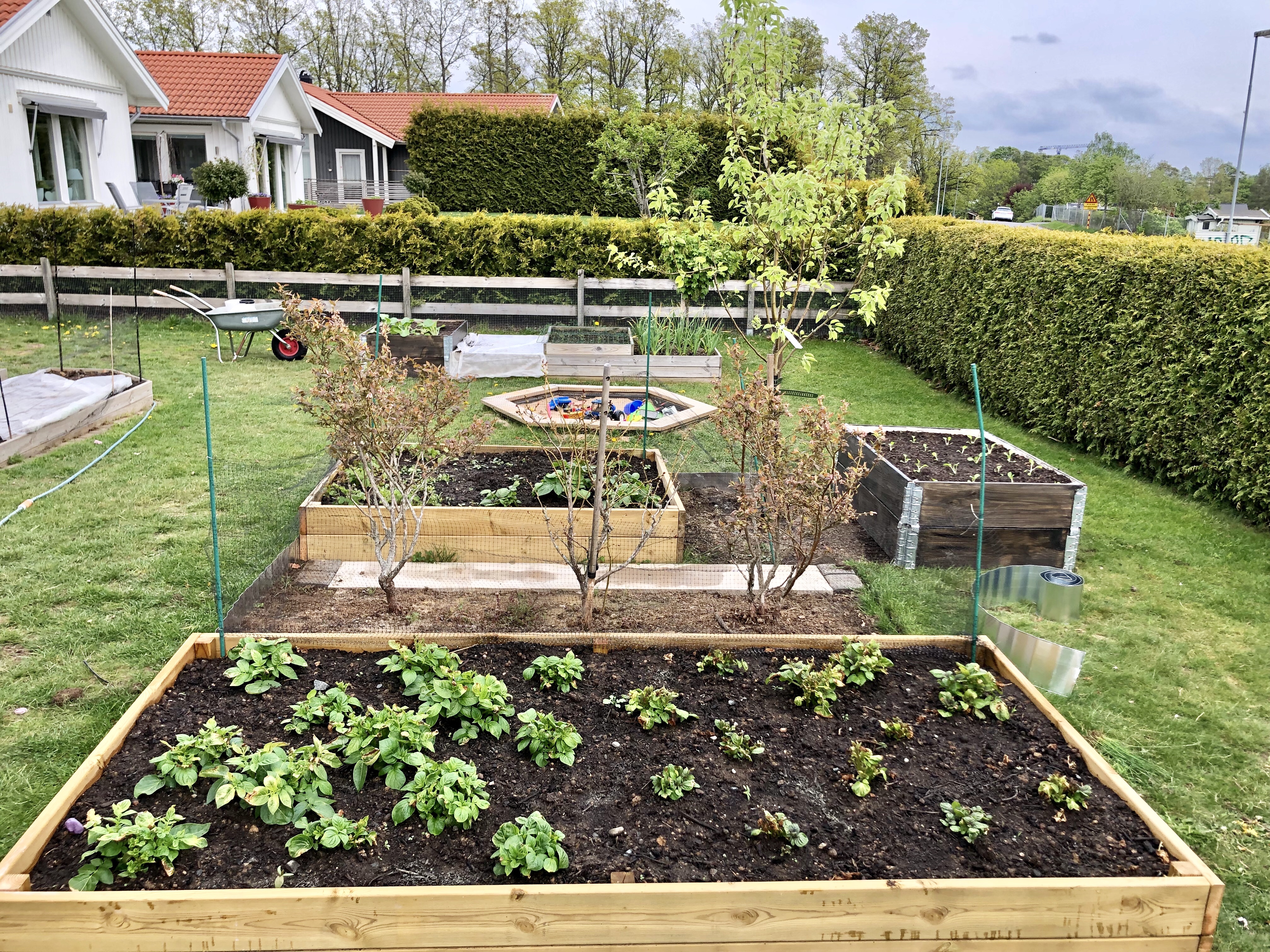 Filip och jag började med en sväng på Nyströms och plantagen i hopp om att hitta fläder-buskar, men det gick så där. Åkte till blomsterlandet sen och hittade två sorter, en klassisk och en röd sort (hette ). Sen har vi fyllt och planterat i några fler pallkragar och lite annat, här kommer en liten guide genom vår trädgård! Vill man se mer finns en film i min profil på Instagram (lindagladh).