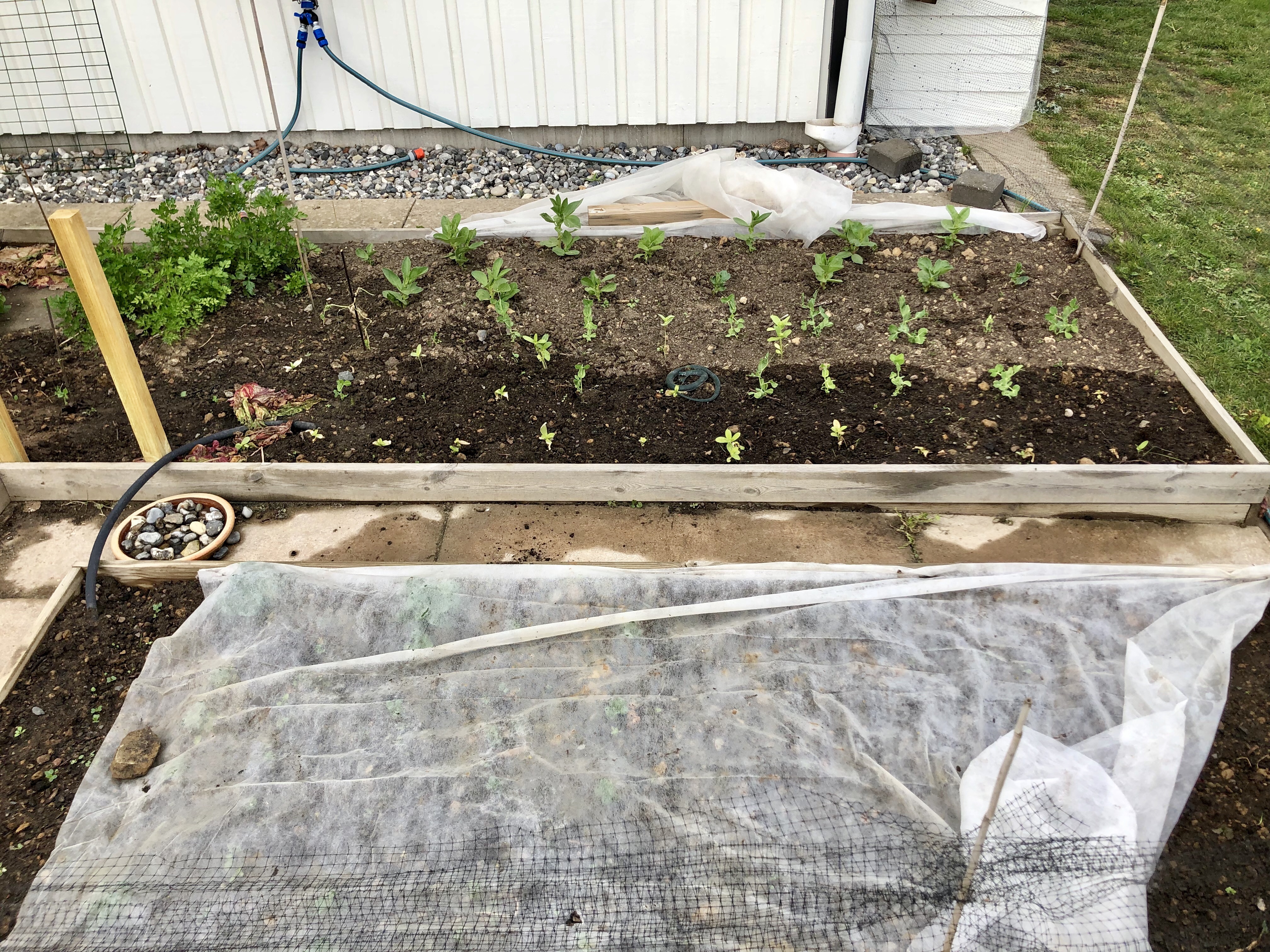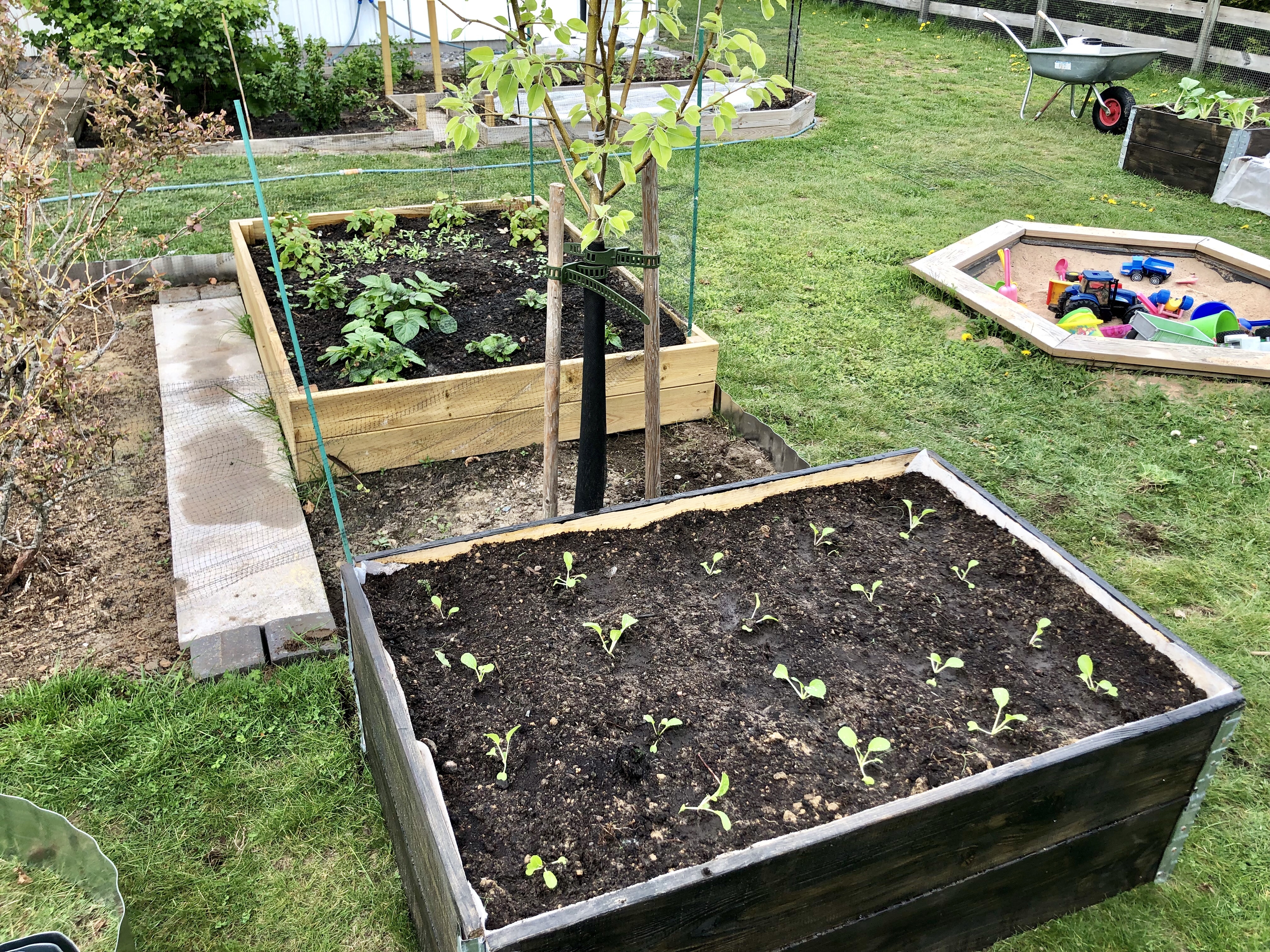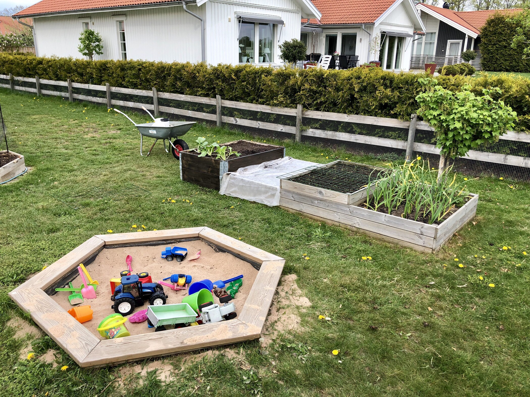 I landet bakom sandlådan är det från vänster till höger: mangold, dill & salladslök (tror dock inte den senare kommer ge nåt resultat), morötter och så vitlök samt ett vinbärsträd.