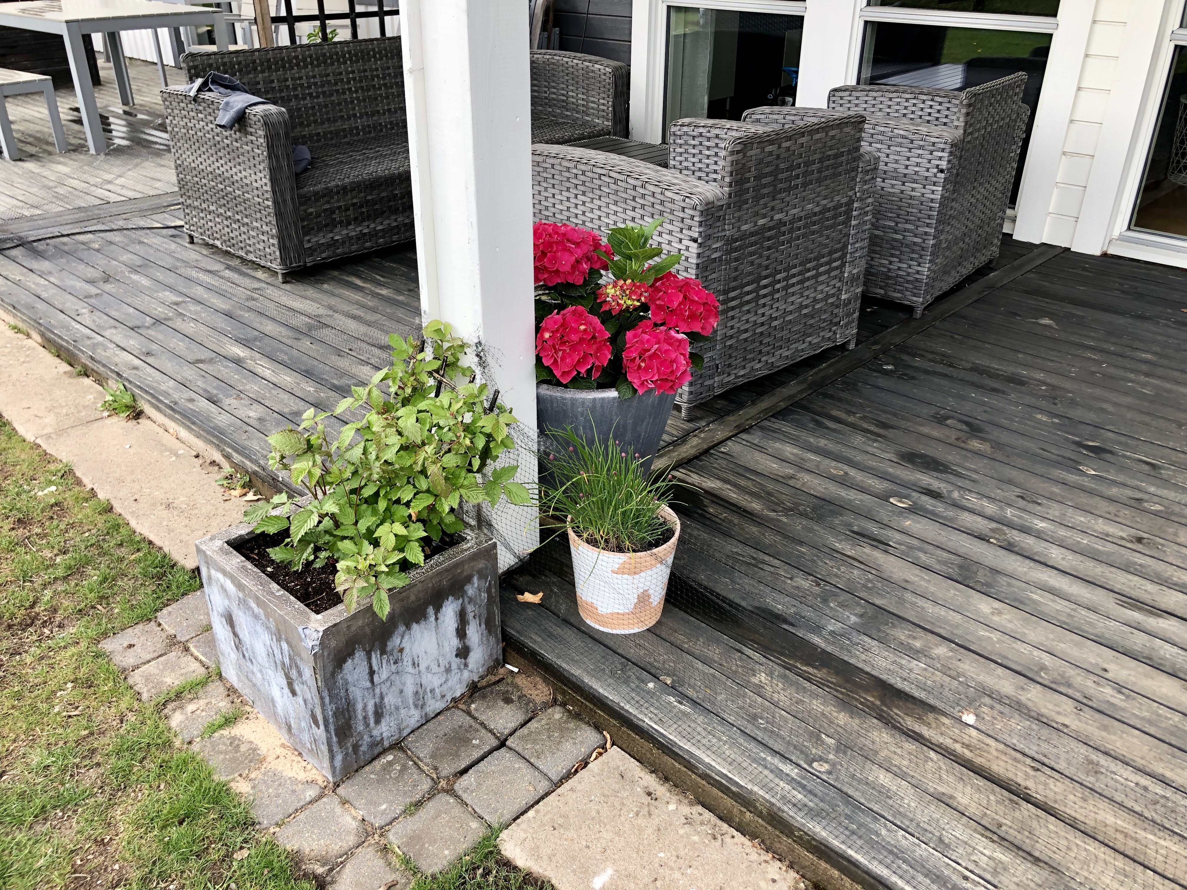 Vid altanen planterades björnbär i höstas, nu har den sällskap av gräslök och hortensia!