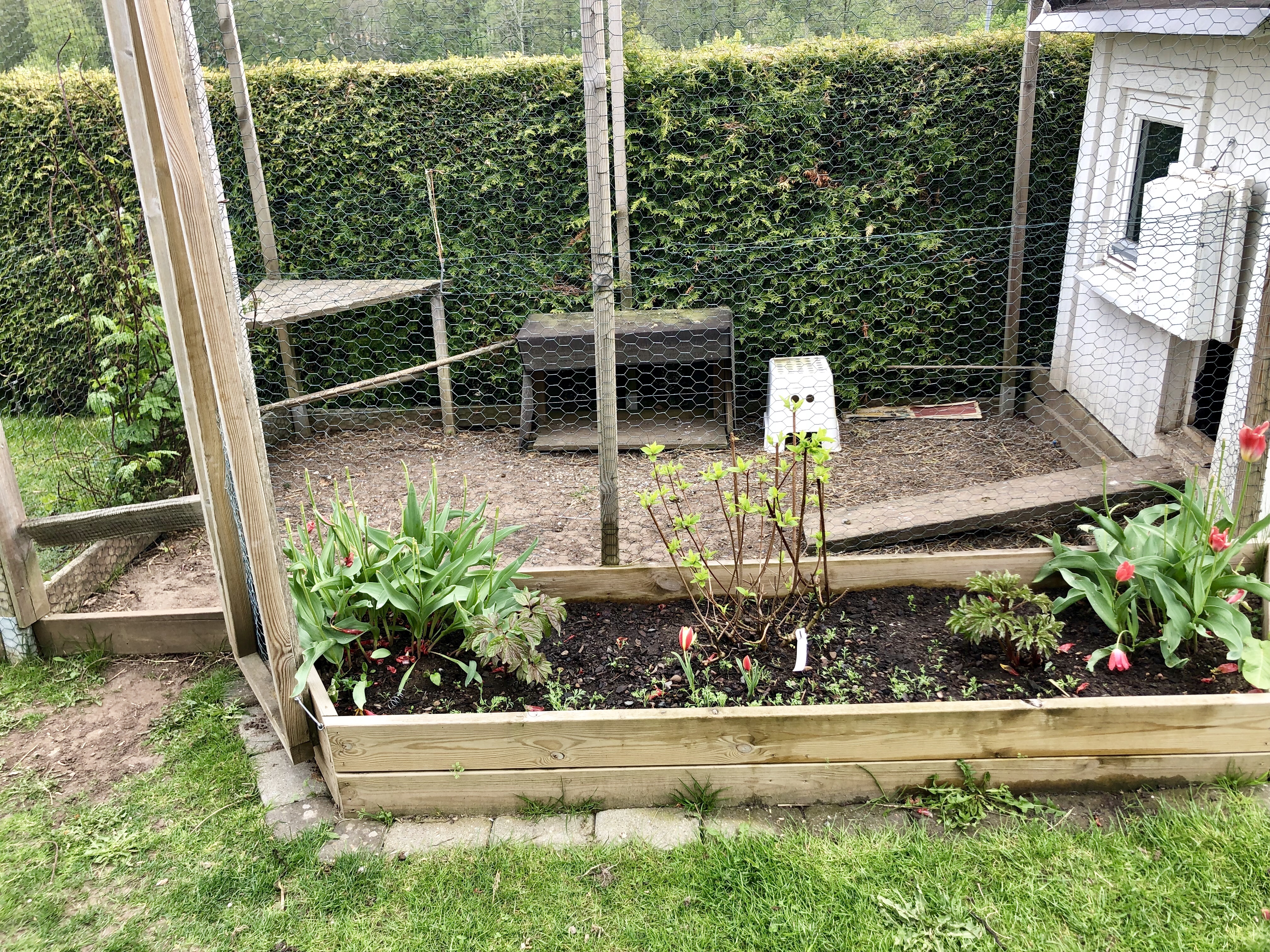 Utanför hönsgården växer Pinkie-Winkie i mitten, en syren-hortensia. Den flankeras av pioner och resterna av tulpaner.