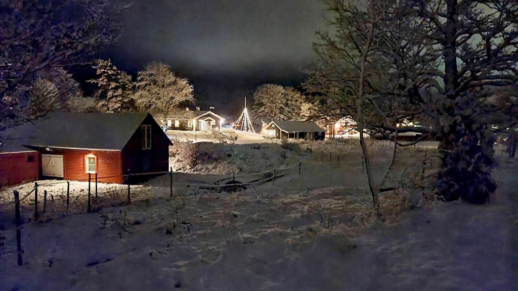 Måste bara visa en sista bild, även om det inte syns så väl – men eftersom jag var ute lite innan solen riktigt gått upp så blev då så coolt när de första strålarna nådde vindkraftverken borta i Skärstadalen, i verkligheten såg det ut som de riktigt lös av sig själva!
