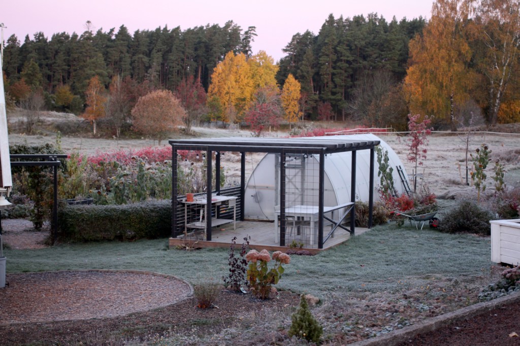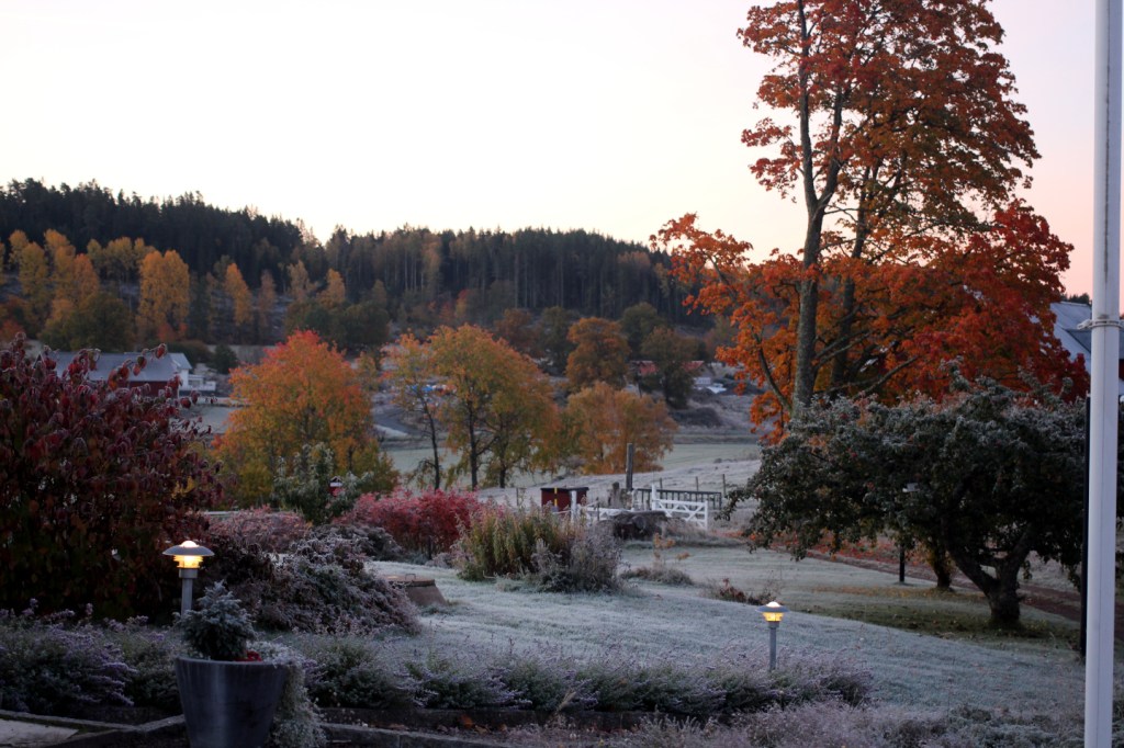 Jag brukar kliva upp strax innan åtta på helger – det känns som en lyxig sovmorgon efter nästan 16 år av extremt tidiga morgnar med barn. När jag klev in i badrummet blev jag först lite perplex, för hela badrummet badade i ett mjukt, rosa ljus – men jag fick snabbt förklaringen när jag kollade ut. Vilken morgon! Färgerna försvann så fort, så fort, men jag hann ut och fota när det var alldeles ljuvligt pastellfärgat ute, med frost på varenda gren och grässtrå. Har varit glad hela dagen tack vare den fina morgonen!