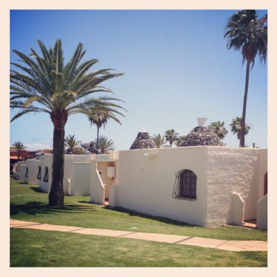 Efter 5½ timmes flygresa landade vi och tog bussen ut till vår destination – Parque Christobal i Playa del Ingles. Vi blev väldigt positivt överraskade över anläggningen, alla bungalows verkade ganska nyrenoverade och var jättefräscha, och själva parken var rymlig, grön och välskött. Poolerna såg lockande ut, det var ändå omkring 22 grader och vi kom ju i jeans, men det var lite småkyligt att bada, mest för att det blåste en del (jätteskönt när man inte var blöt däremot).