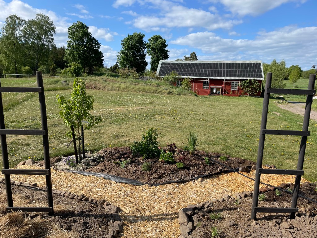 Är så nöjd att vi anlade en ny blomsterrabatt här, och har planterat lite mer träd – det är en start till en mer lummig och blomstrande gård.