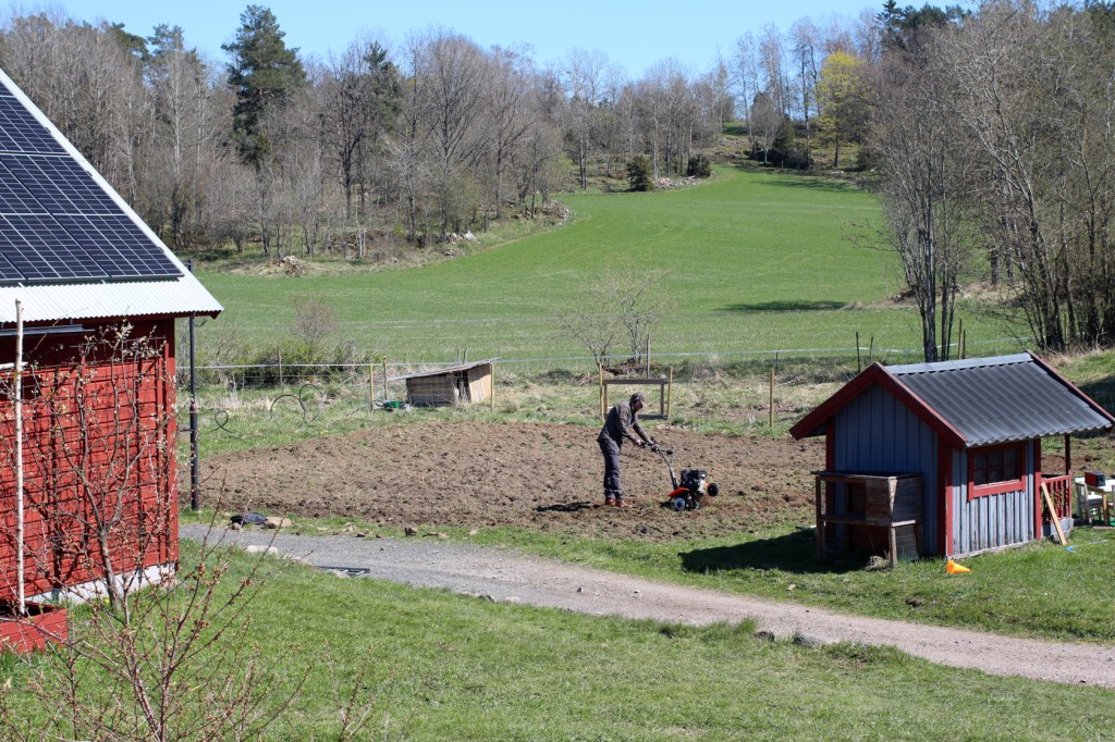 Köksträdgården, som var rent kaos när vi flyttade in, börjar komma i verkligt fin ordning och från och med i dag är det sått i alla land utom Filips. Garaget är också fint, nymålat och med nytt grus framför framsidan, och nu har klätterväxten fått sällskap av en liten lönn med. Fina färger på lönnlöven mot den mörkgrå fasaden!Nya blomsterrabatter med än så länge små växter, men det tar sig! Det bakre landet är inte klart att så i riktigt än, vi får se när det blir 🙂Inne i växthuset är nästan allt utplanterat, och lite försådder står och väntar på tillväxt och utplantering. Nere vid stallet har vi ju mina tomatlådor, dammen vi grävde ner förra året, ett potatisland som är nytt och en potatisåker (syns inte men ligger till höger) som också är nytt. Studsmattan är ju inte den vackraste, men en omtyckt punkt av barnen såklart.