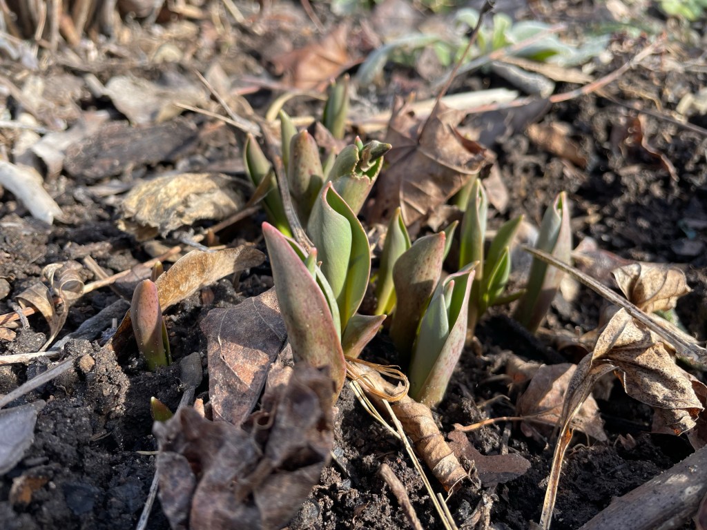 En daggkåpa som letar sig mot solen under allt gammalt skrufs. Lökar av alla de slag har försiktigt börjat kika fram med.Och till och med små blad i vecken på klematisen i köksträdgården!