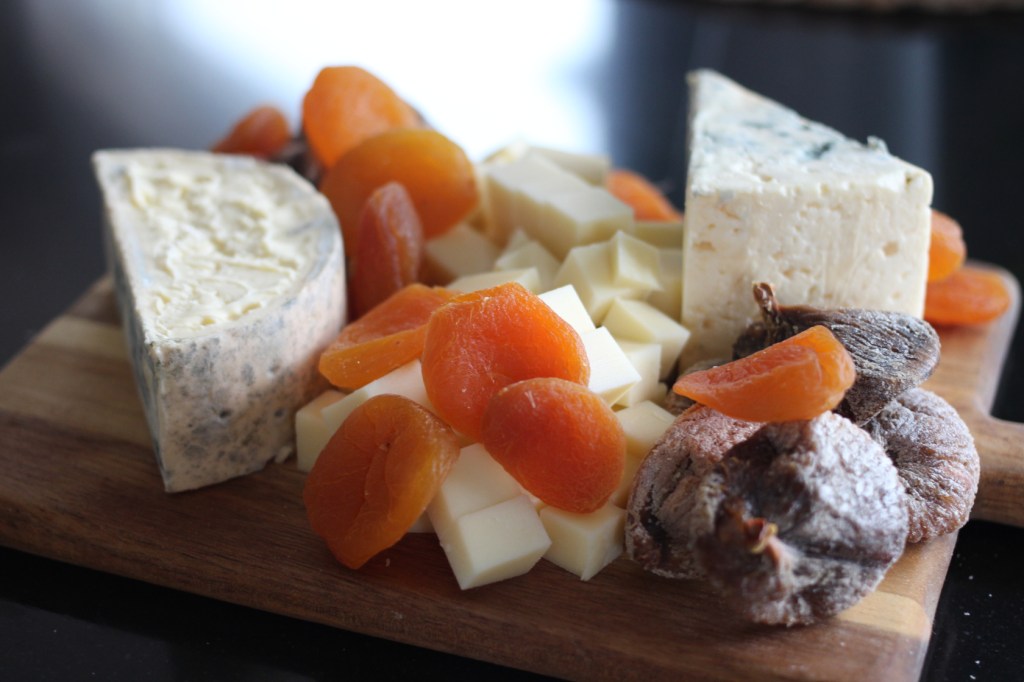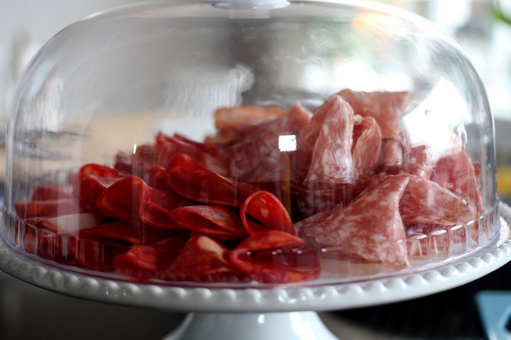 Ostarna behöver inte vara någon svindyr variant, det här är vanlig ädelost och blå castello ihop med lite tärnad gruyere och så torkad frukt. En brie hade kompletterat med. Det är kul att bygga lite på höjden och välja något annorlunda att lägga upp på, här blev det ett tårtfat med salami. Nä, vi avslutar med en till ostbild – för det finns inget bättre eller? MUMS!