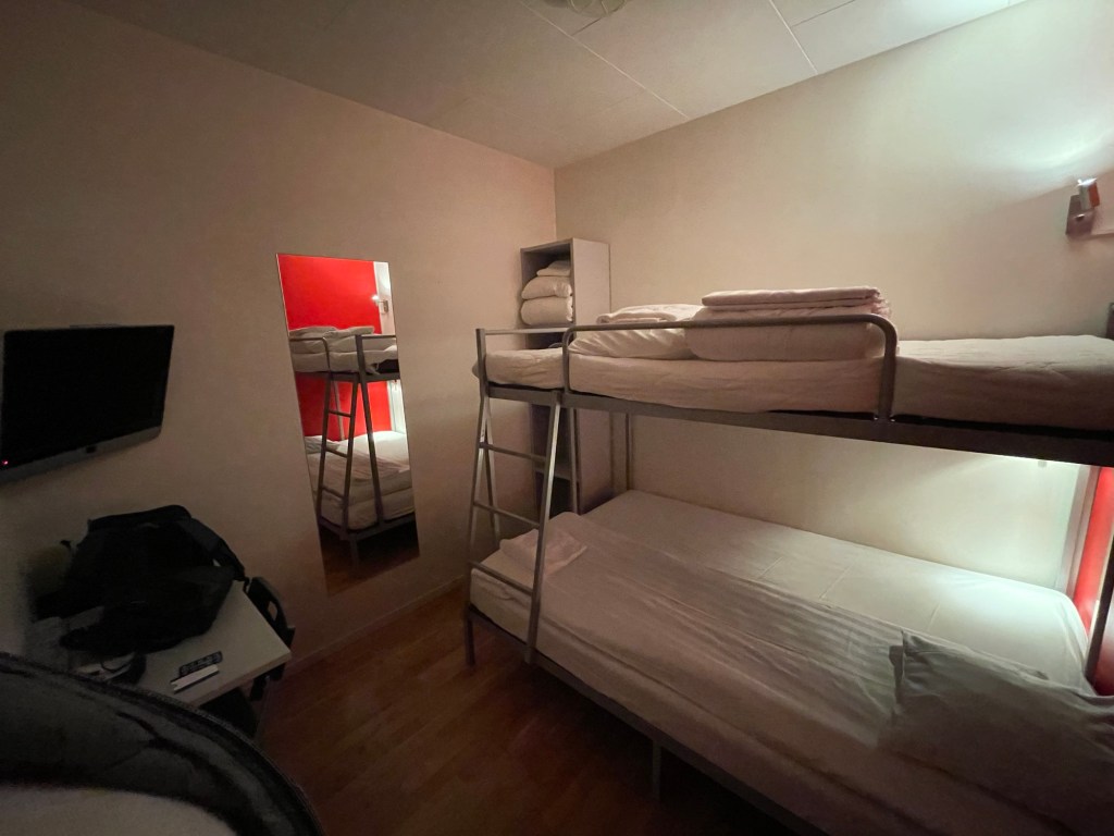 Sa jag att rummet inte hade några fönster, att TV’n hängde i en konstig vinkel ner mot golvet och att det var typ 28 grader i rummet med? Det stod en golvfläkt i ett hörn och ganska snabbt fattade jag ju att den behövdes. Ett tag under natten så funderade jag på om jag kunde typ sova med öppen dörr, men det funkar ju inte på ett ”hotell”. Ingen vidare bra sömn den natten heller med andra ord.