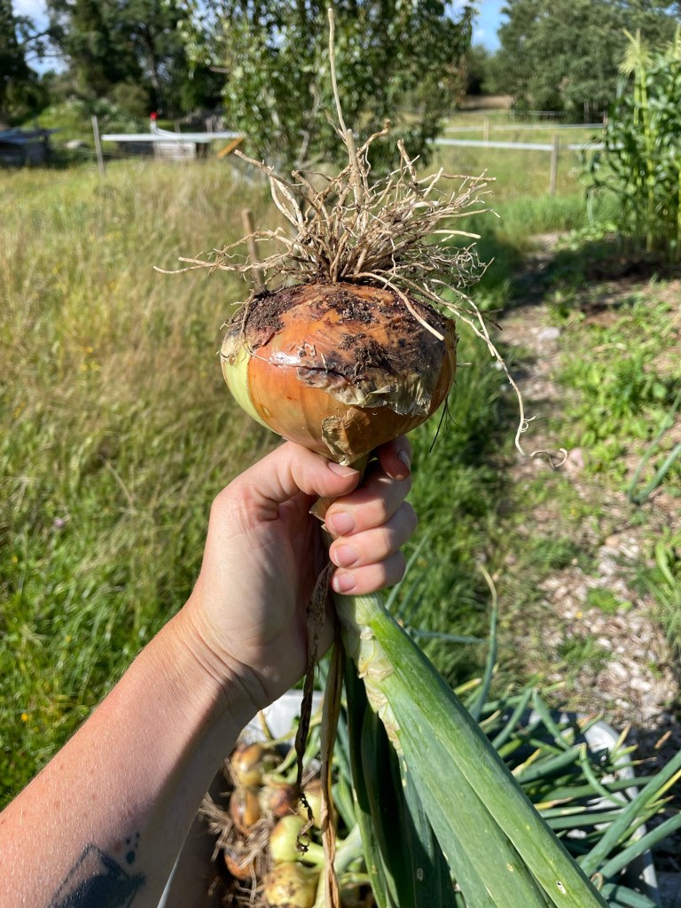 Förutom diverse smågrejor som dök upp så att säga i arbetande stund, så var sista lite akuta saken på listan att ta upp löken. Om inte tomaten och potatisen levererat nåt vidare så måste jag säga att löken överträffat alla förväntningar! Det blev både mycket och stort.