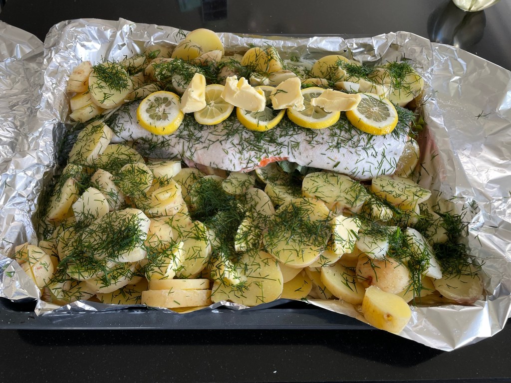 Fick sedan inse att klockan var fem och det var extremt hög tid att börja med maten – jag hade köpt regnbågslax på Citygross, det är rätt sällan vi äter firre dessvärre men nu blev jag verkligen sugen – plus att det var kampanj. I alla fall – det här är världens längsta inledning – när jag stod där i vår utekök och borstade potatis och fjällade laxen så kände jag att i ett annat liv, då hade fisken varit egenfångad med. Jag fattar att säkerligen det mesta i allas vardagsliv säkerligen var mycket, mycket sämre för säg 100-150 år sedan, men ändå. Tillfredsställelsen att odla sin egen mat och plocka in bär och frukt, att sylta, safta och lägga in för vintern, den är så grundläggande och trygg.
