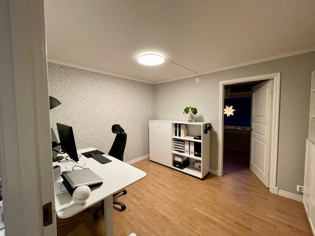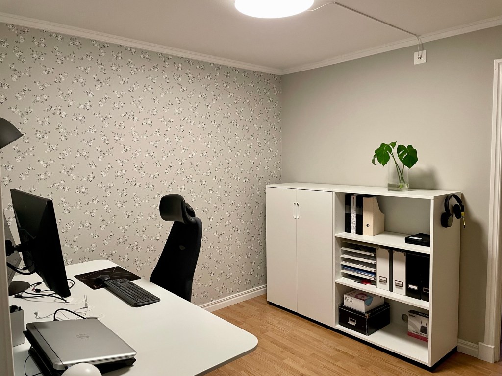 Det är väldigt skönt att ha ett rum som är dedikerat ”kontor”, så slipper de sakerna skräpa runt i andra rum. Dessutom himla bra placering av detta rummet, med lite uppsikt över entré och även bortåt övriga huset mot köket, man är liksom inte helt ”off” här. Är himla nöjd med hur mycket ljusare det blev, och bara att det är helt i ordning, det blev ljusare i hela hallen nu faktiskt.