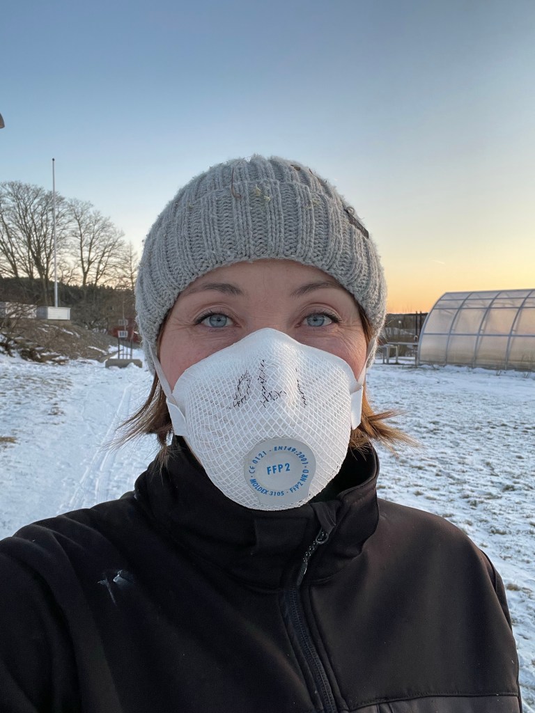 Sen blev det dags att åka och hämta ett lass hö från en dam i området som skulle tömma sitt höloft – gammalt hö, men det funkar ypperligt som bäddmaterial till grisarna och till hönsens reden. Det var dock lite dammigt, så när vi skulle tömma hela släpet så drog jag på mig nästa mundering: