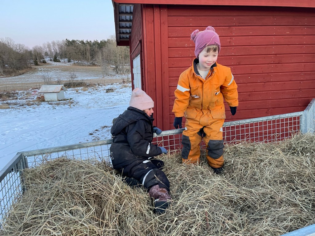 Det var nog bra, för när vi lastade släpet så nös jag som en tok, hahaha… Men alltså, det ÄR så tacksamt när man kan få sånt här och dessutom gratis – de blir av med det de inte vill ha och vi får möjlighet att få sånt vi behöver. Glad blir man då! Filip och hans kompis åkte ”modernt hölass”, alltså i bilsläpet med hö när vi rullade fram det på gården, och hade väldigt roligt med att hoppa runt i det. Kommer absolut hitta hö ända in i kalsongerna där tror jag… Grisarna fick hela huset fyllt med hö och det kan behövas nu när det blir ganska kalla nätter framöver.