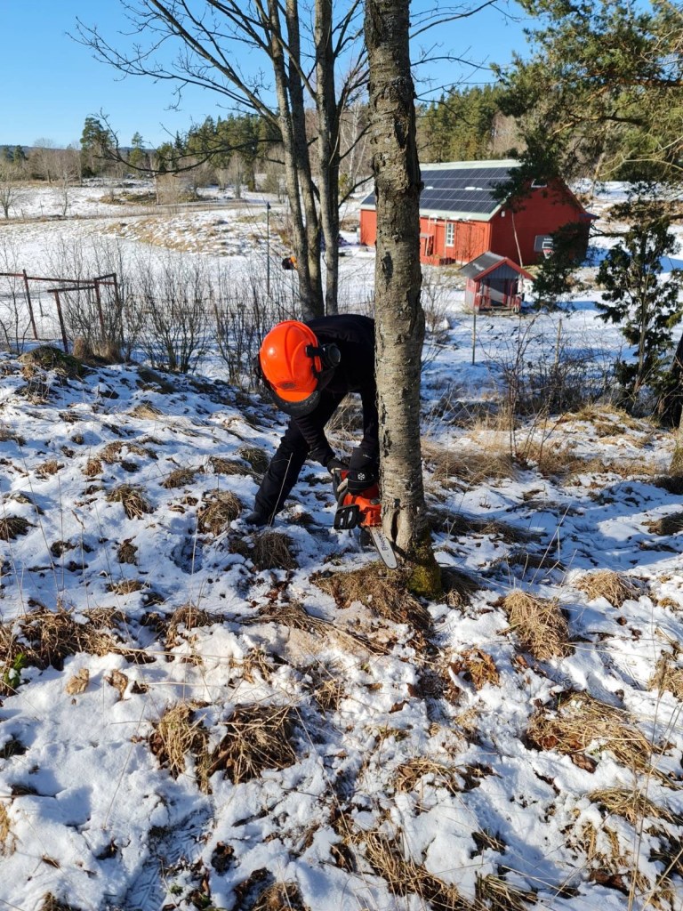 Sen ville man ju ändå liksom GÖRA nåt – det är alldeles för kallt för att bara sitta still ute, även mot en södervägg. Jag kom på att det fanns ett par gamla döda träd på en av kullarna, så jag letade fram motorsågen och gjorde mig extra fashionabel med looken ”hjälm ovanpå mössa”.