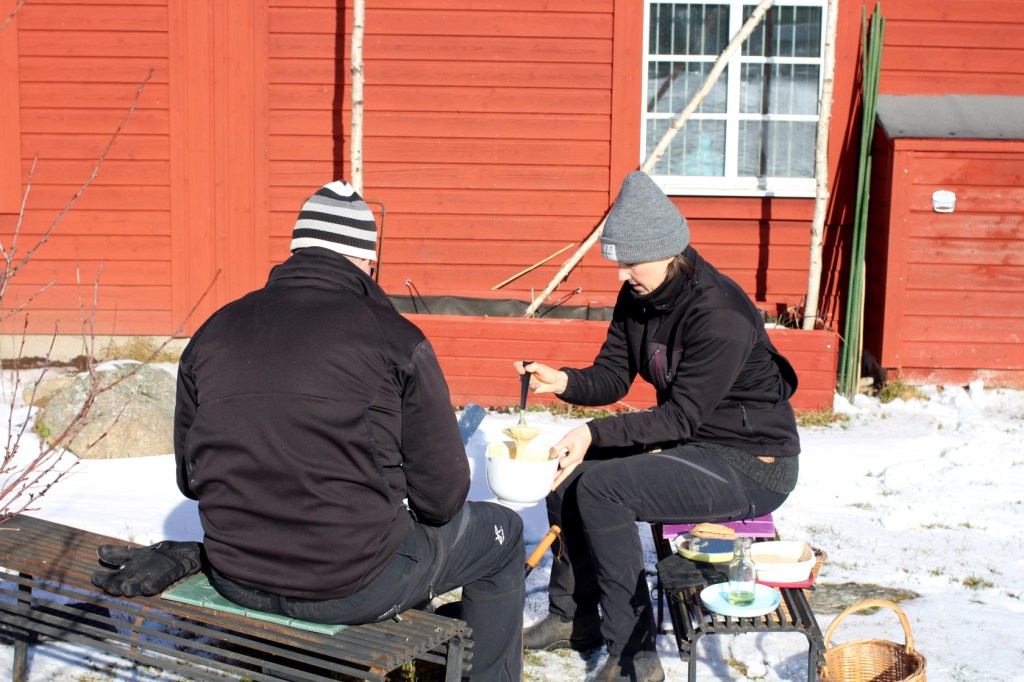 Det var ju hur soligt och härligt som helst idag, men också ganska kallt. Dessvärre för oss – för vi hade en massa små projekt och sysslor vi tänkt få uträttade under dagen, men allt som har med stängsling, stolpar och gräva fick liksom vänta, det är ju tjäle överallt. Så, vi fick tänka om lite, för ute vill man ju gärna vara i solen. Vi hade en liten gäst idag också, Filips bästa kompis, så vi började med att grilla lite krabbelurer ute.