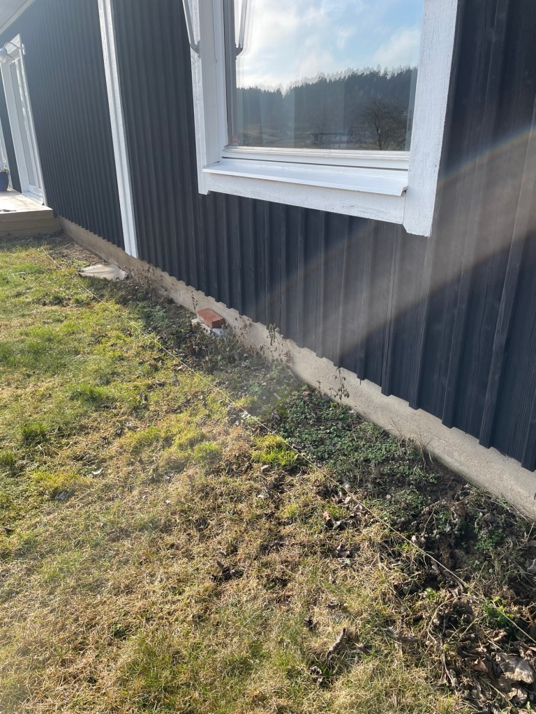 I helgen var det premiär på nåt sätt för ”gårdsarbete”, vilket kan innebära diverse olika saker i planerat eller oplanerat utförande, bara det utförs utomhus. I helgen innebar det att jag började förbereda för det nya blomlandet på östra sidan av huset, genom att lägga sten utmed fasaden, det som mest ser ut som ogräs här: