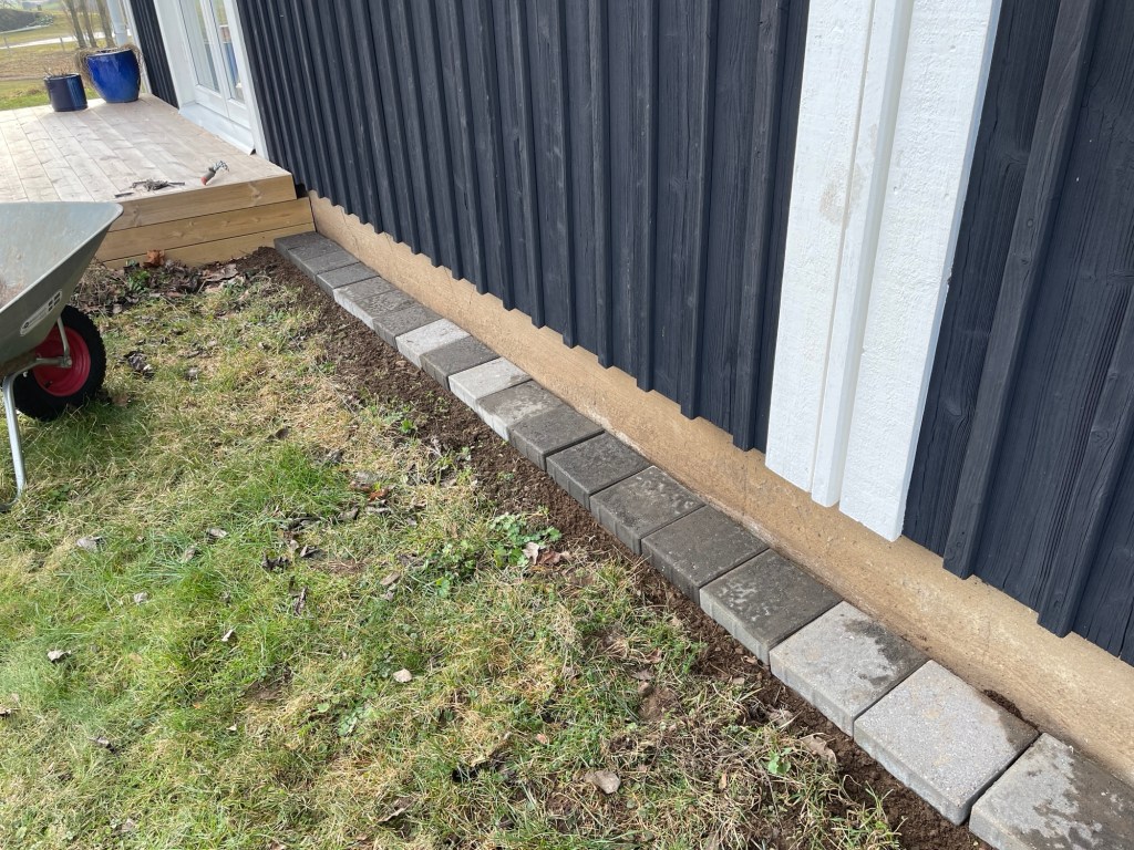 Det hann i alla fall bli klart på lördagen, och på söndagen bar jag dit de kantsten som ska bilda kanten mellan gräs och rabatt sedan. Maken satte de sista hängrännorna på stallet, som inte haft hängrännor innan, skönt!