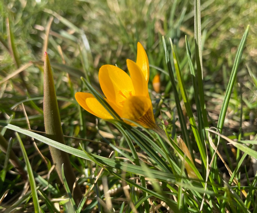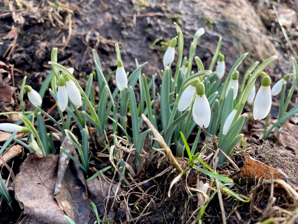 Några få vårblommor börjar ta sig upp, på de varmaste ställena. Var rädd att alla snödroppar skulle bli förstörda på ”griskullen”, men åtminstone en del kluster finns kvar i leran.