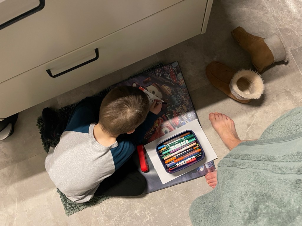 Den här bilden är från torsdagens pass, men i lördag firade jag pass nr 300, som jag skrev om för nån vecka sedan. Haha, var tvungen att fota detta, tror nästan aldrig jag är själv i badrummet när jag duschar, det är alltid minst 1 barn som vill prata eller fråga nåt, eller som här där Filip bara ville ha sällskap när han målar. Tänker att jag kommer sakna detta när alla är stora.
