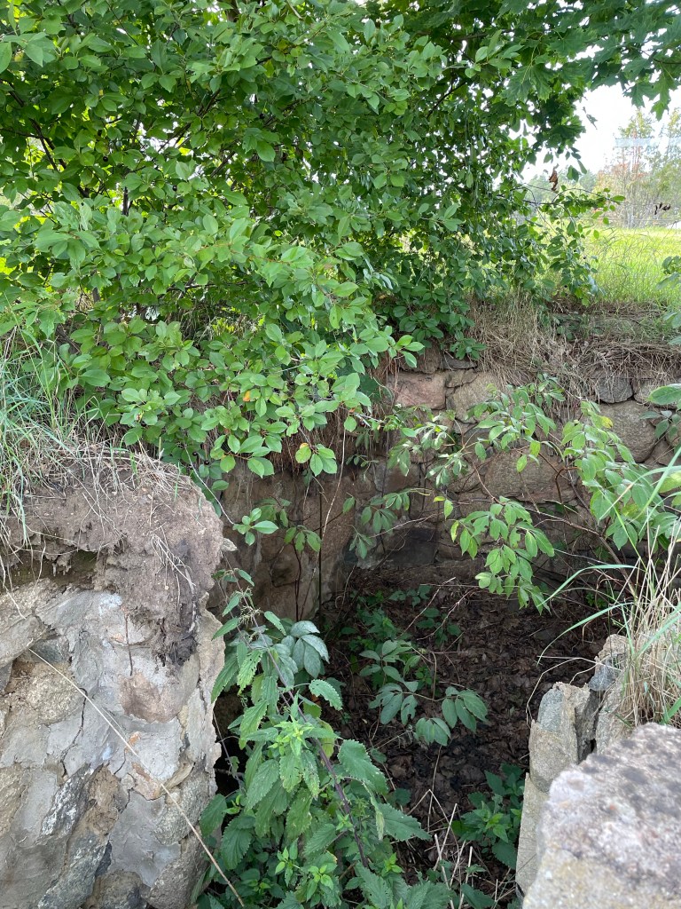 Så, ”jordkällaren” då. Jo men det är en gammal jordkällare, fast helt utan tak. Jag skulle tippa på att den inte använts på MINST 30 år eller så. I somras tog jag lite bilder in i den, men det växer en hel del där så det är lite svårt att se: