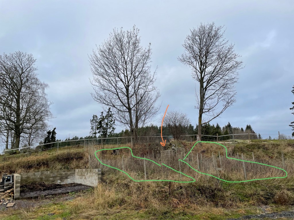 Där jag har markerat med blått kommer det nu då bli stenslänter runtom, vi lägger en markduk under för att ha ihjäl åtminstone det värsta ogräset (körde röjsågen och slog ner det värsta innan). Tror det kan bli riktigt fint! I mitten ovan ser ni även pallen som står för att hindra att barn går in i jordkällaren.