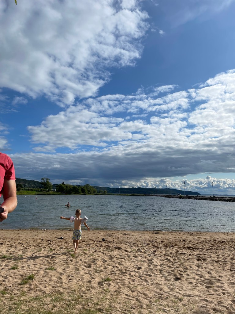 Sitter vid sidan av badplatsen i Gränna, fullt påklädd och med en handduk för extra värme i de kalla (men sydliga?!?) vindarna. Maken, Lukas och Filip är o och badar en sväng i det kyliga vattnet, så trist semesterväder när man inte får lite värme.
