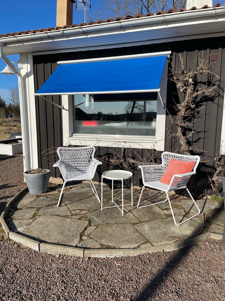 Den knallblå markisen är inte direkt en färg JAG hade valt, men oavsett så är det faktiskt väldigt praktiskt med markiser. Men visst blev det lite gulligt med möblerna?