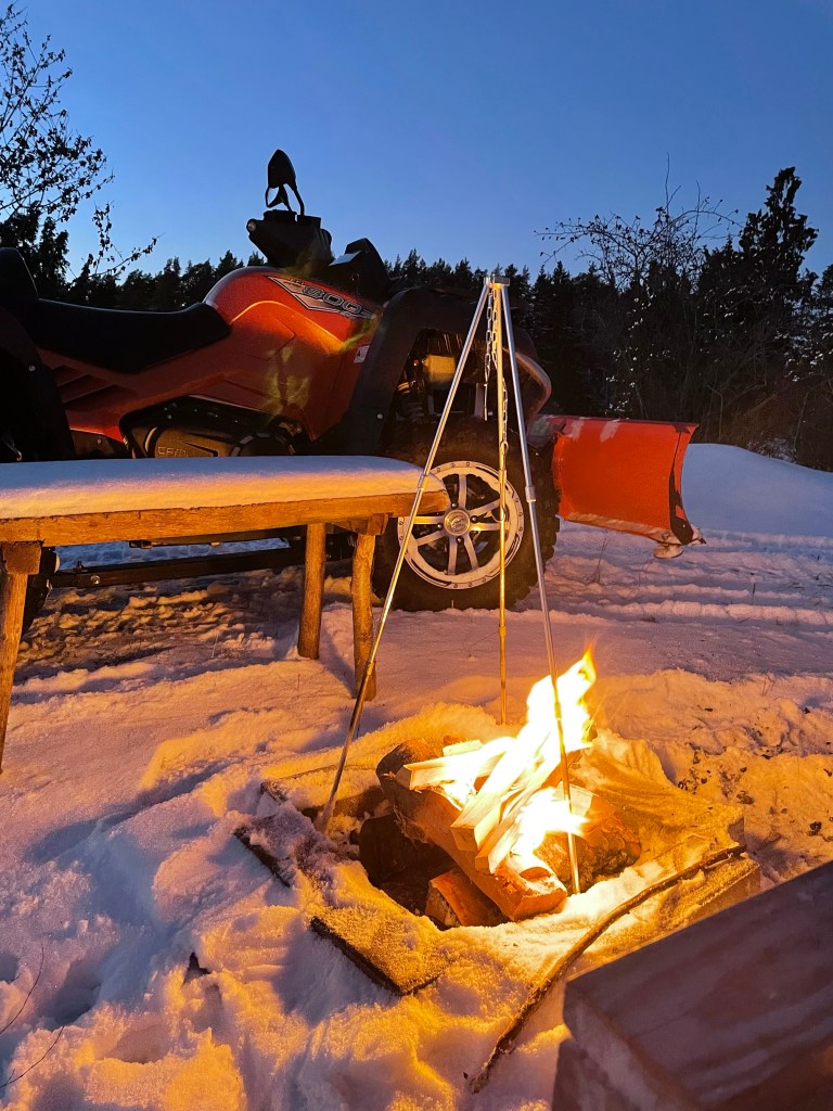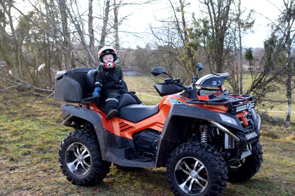 3 – fyrhjulingen! Det här ger så många blandade känslor, dels bortskämt med en fyrhjuling, blandat med lite pinsamt för vi har ändå bara 2 hektar mark men ändå får den tredje känslan överhanden för FY VAD ROLIGT DET ÄR! Svinkul att köra, och man känner sig så himla kapabel? I går skottade vi vår och grannens gård med den, nu i eftermiddags använde vi den för att dra upp några tunga betongfundament till kullen så vi kunde göra en till bänk till grillplatsen, och sen bara för att det är så roligt så körde jag och hämtade ved och så satt vi där en liten stund och njöt av solnedgången… Känner vi inte att vi har nytta av den om ett tag kan vi alltid sälja vidare, men skit i det nu, nu njuter vi bara av en grej som hamnade RAKT in på rolighets-kontot! Oliver utbrast ”nu behöver vi inte åka till Liseberg mer” när han åkt med, Lukas hade kanonkul och Filip ville inte ens kliva av… En riktig bonusgrej till oss alla!