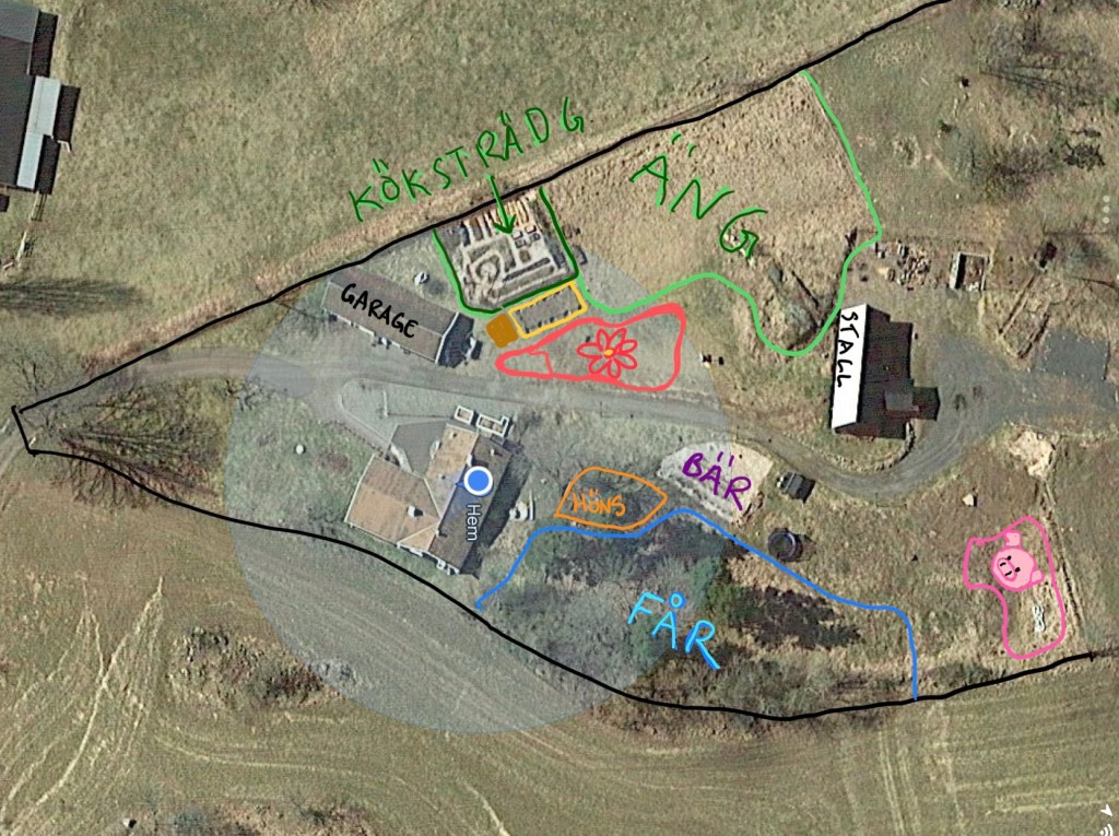 Så här ser en översikt av trädgården ut. Det gula är vårt växthus och idag när jag sitter och drömmer så är det området med den röda blomman jag har i huvudet. Lätt att tro att det är en liten yta, men den är nog runt 150-200 kvadratmeter…