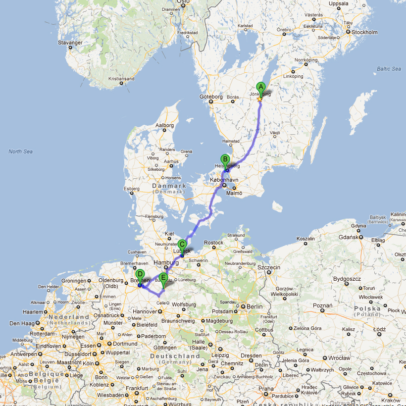 Alltså, vi kör i ett svep från Jönköping ner till Lübeck (C) (tar ca 8 timmar med färjan helsingborg / helsingör samt rödby/puttgarden). Vi har inte riktigt bestämt oss för om vi ska köra på natten, för att barnen ska sova, eller på dagen, så att vi får sova. Jag tar gärna emot tips när det gäller det!