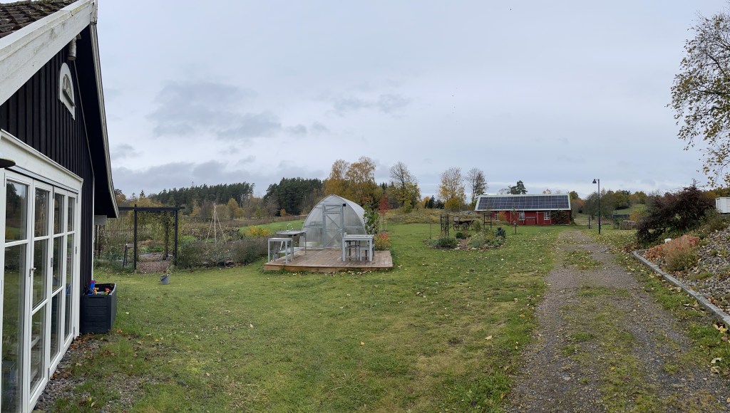 Jag känner mig nöjd med att jag har ”vintrat in” våra rabatter och växter, genom att lägga ett tjockt lager hö över de som är lite känsliga, och över all jord som var bar. Vi har ju också all potatis kvar i jorden, vi har helt enkelt inte någon bra plats att lagra dem på, så de får vara kvar och tas upp allt efter behov. Blasten är ju dock nerklippt sedan länge – och även här ligger ett tjockt lager gräs över. Helt fantastiskt att se jorden vid täckodling för övrigt, det är såna otroliga mängder maskar, och jorden är fin och lucker. Väldigt härligt, och relativt underhållsfritt!