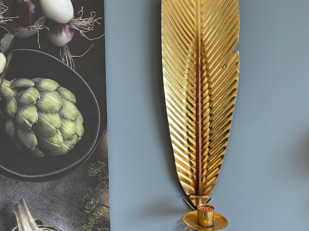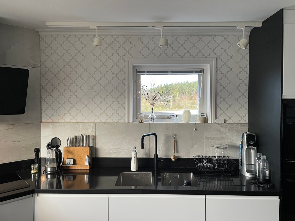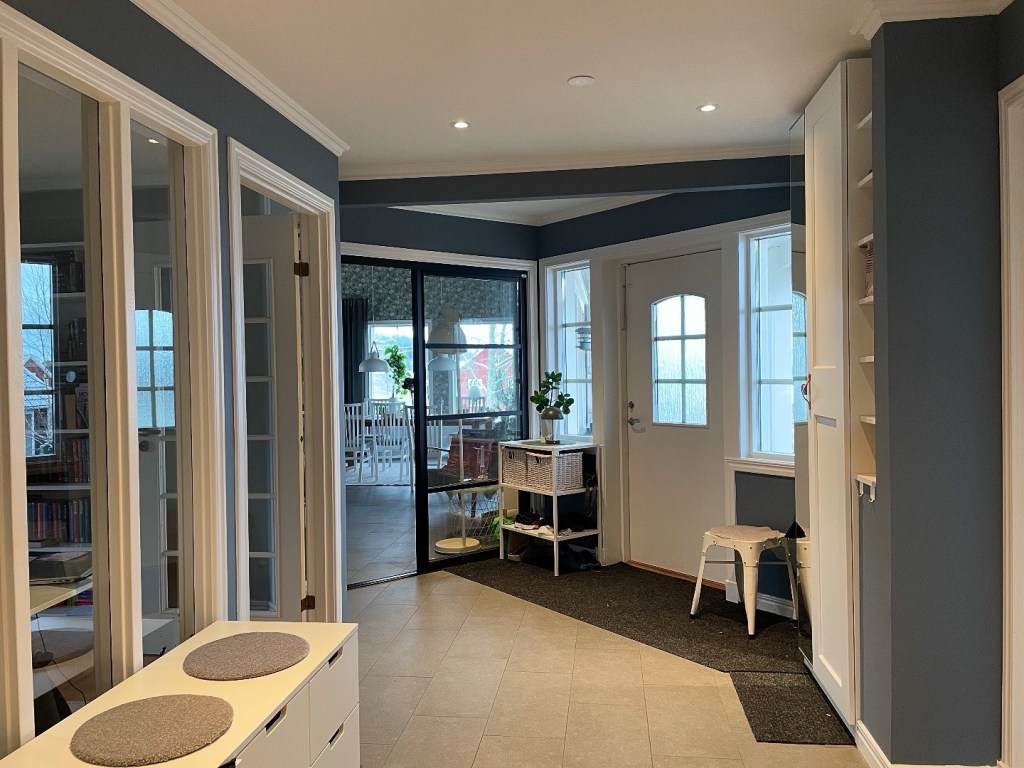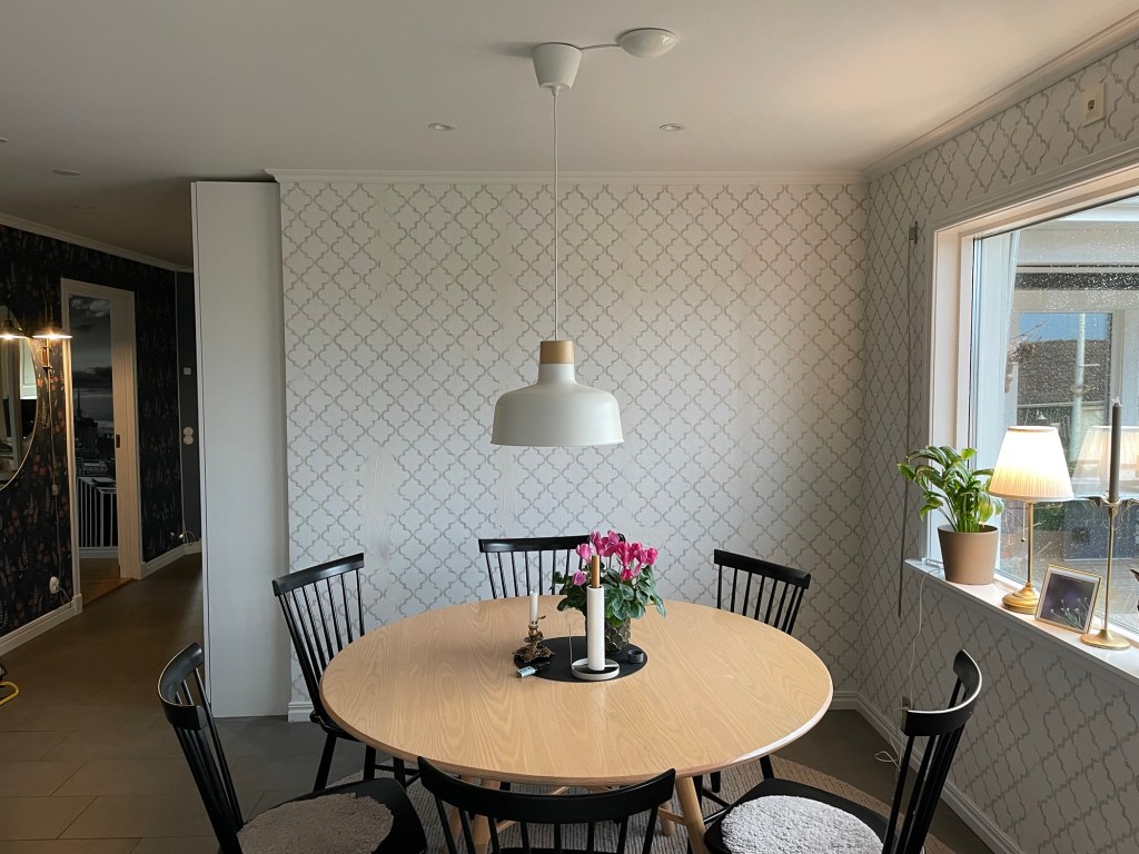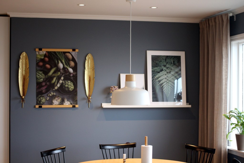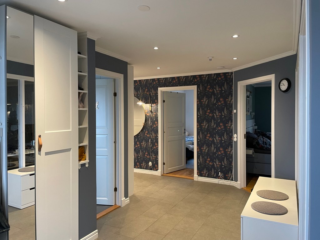 Tänker mig en platsbyggd hylla, runt TV’n, från golv till tak. Till vänster, närmast kaminen som ni inte ser här, vill jag ha hyllplats för ved, i övrigt vill jag ha lite böcker, nödvändig teknik, nån växt och kanske en bakgrundsbelysning av LED. Tänker att tapeten får synas runt TV’n, men att själva hyllan (och en bakvägg till den) får vara mörkgrön. Tänker också att hyllplanen inte ska gå upp till nock som taket gör, för då blir det bara en dammsamlare, utan tänker nog att vi bara täcker överdelen med … kanske pärlspont? Eller nåt som passar in här i övrigt bara, helt enkelt. Borde gå att bygga i MDF tänker jag, och sen måla då.