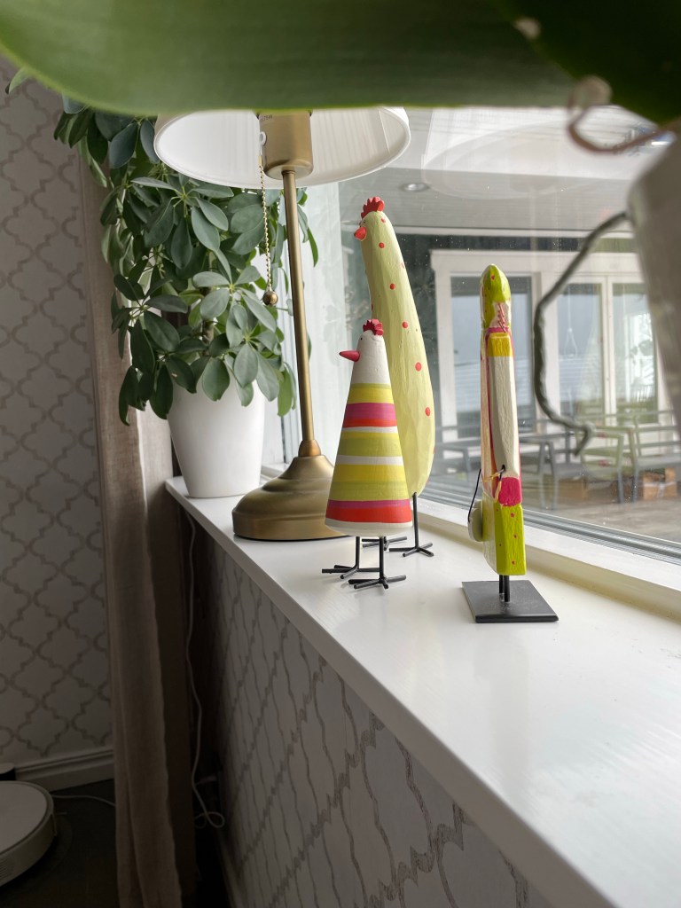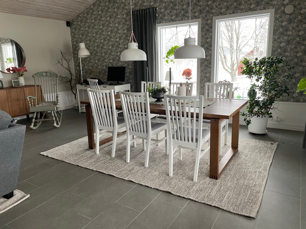 Tänker mig en platsbyggd hylla, runt TV’n, från golv till tak. Till vänster, närmast kaminen som ni inte ser här, vill jag ha hyllplats för ved, i övrigt vill jag ha lite böcker, nödvändig teknik, nån växt och kanske en bakgrundsbelysning av LED. Tänker att tapeten får synas runt TV’n, men att själva hyllan (och en bakvägg till den) får vara mörkgrön. Tänker också att hyllplanen inte ska gå upp till nock som taket gör, för då blir det bara en dammsamlare, utan tänker nog att vi bara täcker överdelen med … kanske pärlspont? Eller nåt som passar in här i övrigt bara, helt enkelt. Borde gå att bygga i MDF tänker jag, och sen måla då.